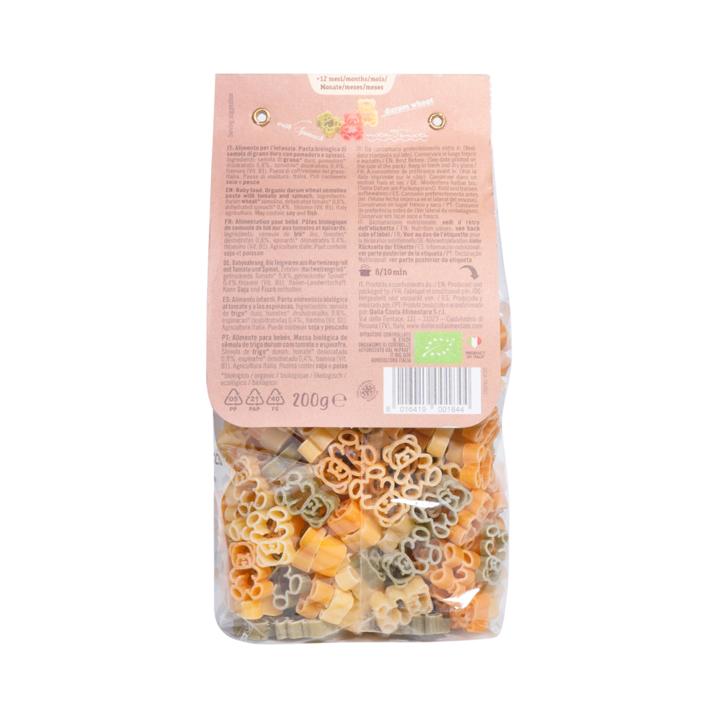 Thành phần : Bột mì Semolina hữu cơ, bột cà chua hữu cơ 0,8%, bột cải bó xôi hữu cơ 0,4%, Vitamin B1