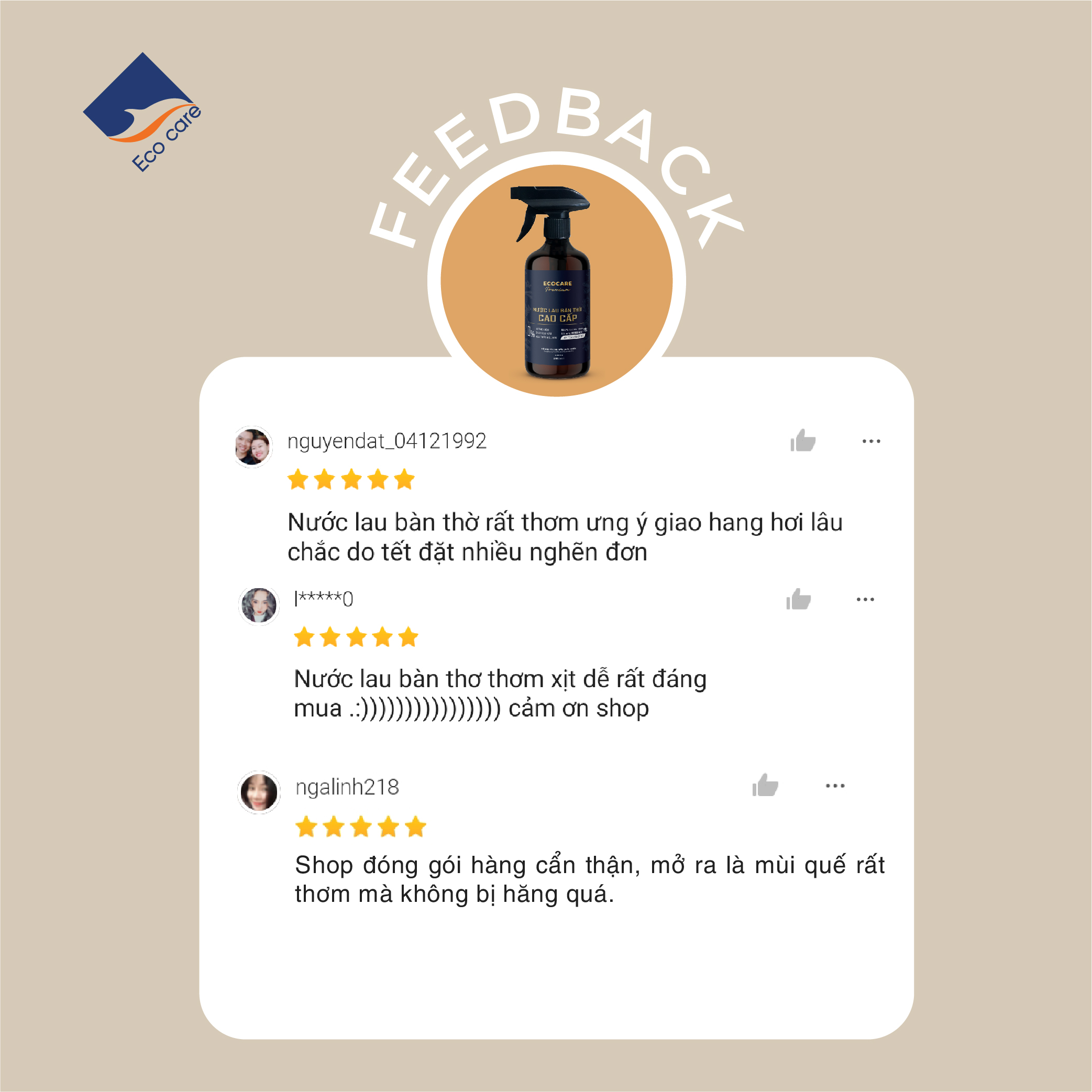 - Trước tiên, Công ty Ecocare xin cảm ơn Quý Khách hàng đã tin tưởng lựa chọn sản phẩm Nước Lau Bàn Thờ Cao cấp Ecocare Gold 300ml, kết hợp Hương Trầm và Quế giúp tẩy uế, mang lại vượng khí, tài lộc