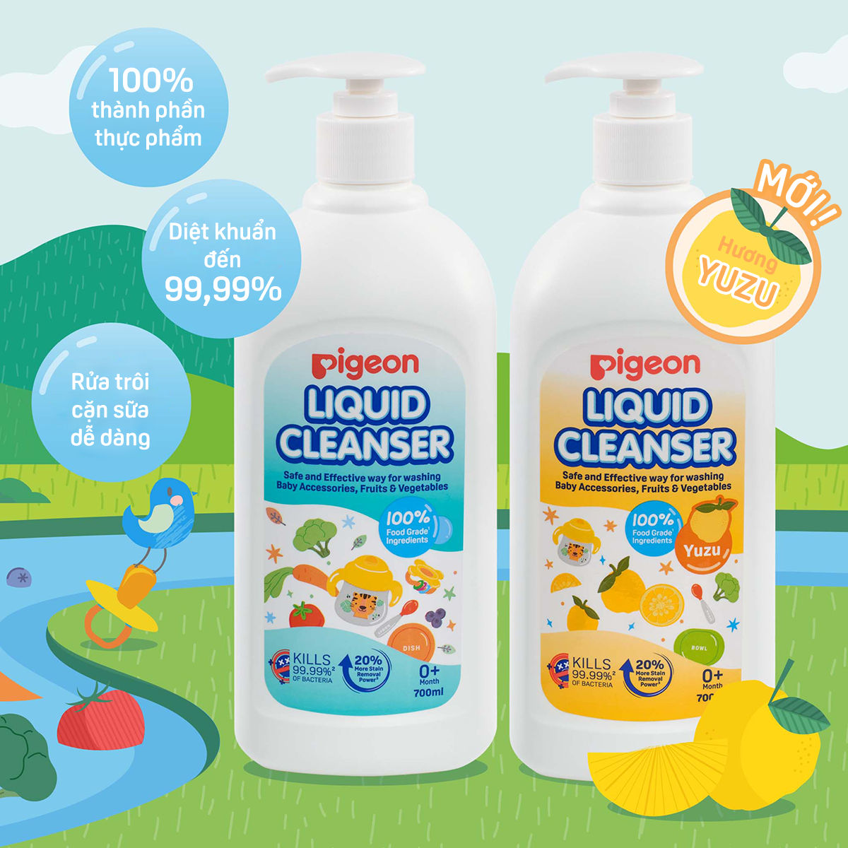 - Nước rửa bình sữa Pigeon hương Yuzu có khả năng diệt khuẩn tới 99.99% và tăng khả năng loại bỏ vết bẩn tới 20% so với nước tẩy rửa thông thường, giúp cho đồ dùng của bé yêu luôn được sạch sẽ và không bị đọng lại cặn sữa hay các vết bẩn tiềm ẩn nguy cơ gây hại.
