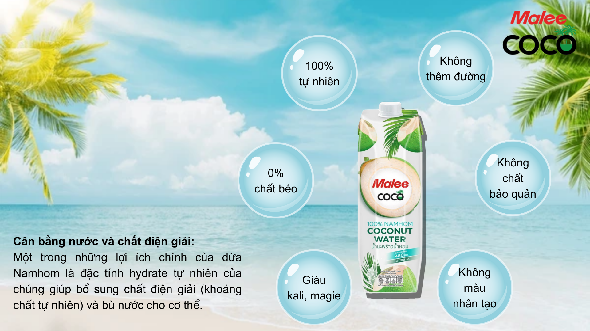 Nước Dừa Namhom Malee Coco là lựa chọn lý tưởng để chăm sóc cơ thể, là nguồn cung cấp Kali, Magie dồi dào cùng các khoáng chất tự nhiên cần thiết khác. Với đóng gói hộp giấy Tetra Pak 1L, sản phẩm đảm bảo tiêu chuẩn vệ sinh an toàn thực phẩm theo quy định, dễ dàng mang theo bên mình để chia sẻ cùng bạn bè hay làm quà tặng ý nghĩa cho người thân.