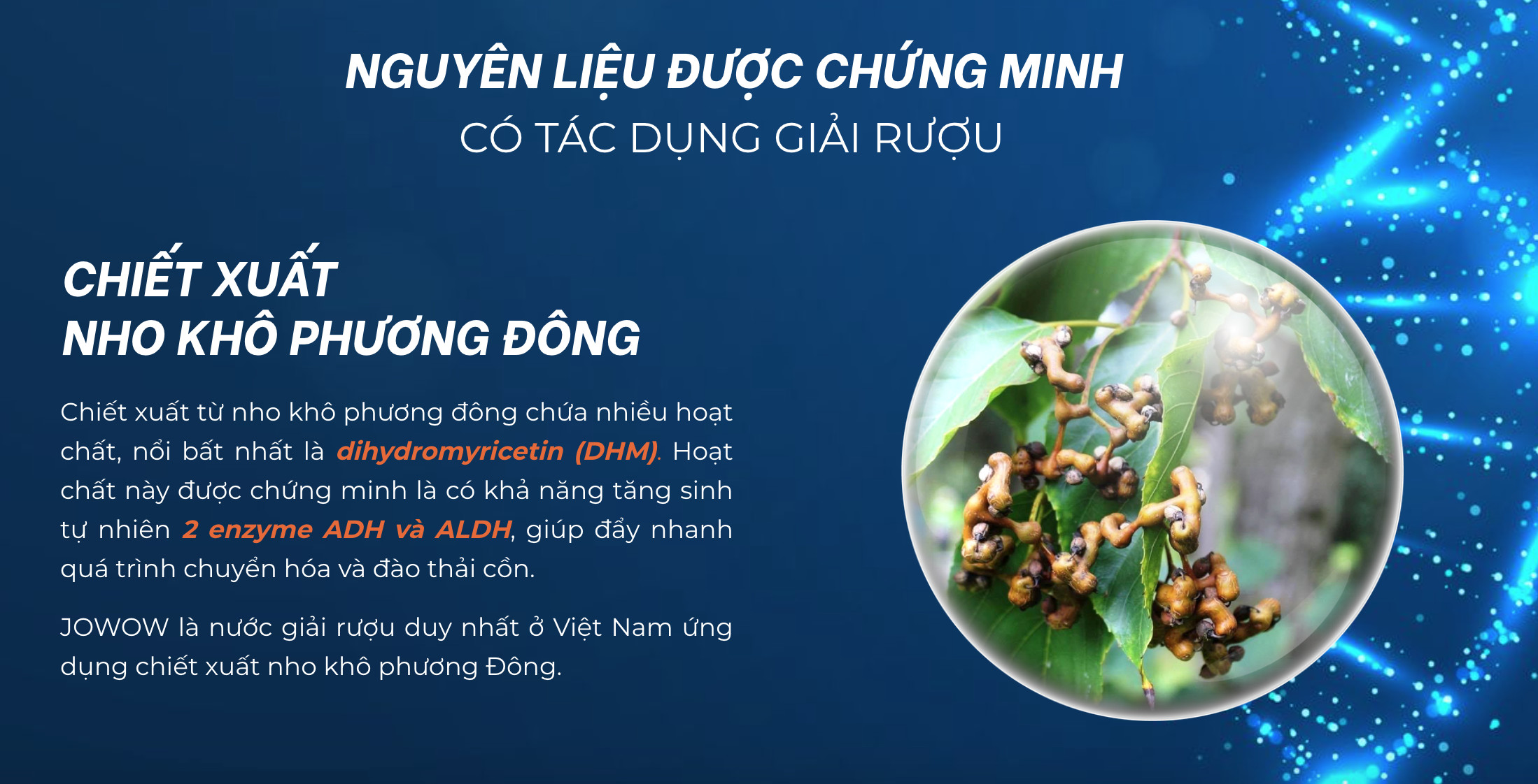 • Hovenia dulcis extract (Chiết xuất nho khô phương đông): một hoạt chất chính trong nguyên liệu này là DHM (Dihydromyricetin) đã được chứng minh lâm sàn là giúp tăng cường sản sinh ADH và ALDH.