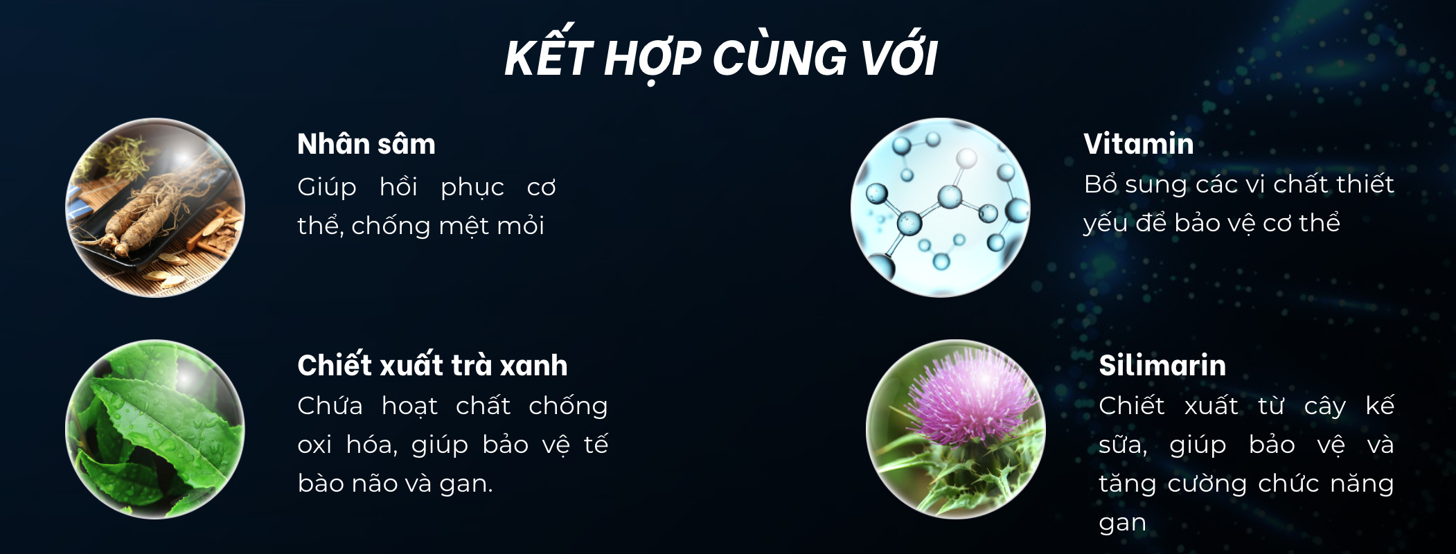• Silymarin: Hoạt chất được chiết xuất từ cây hoa kế sữa, giúp chống oxi hóa, chống viêm, bảo vệ tế bào gan.