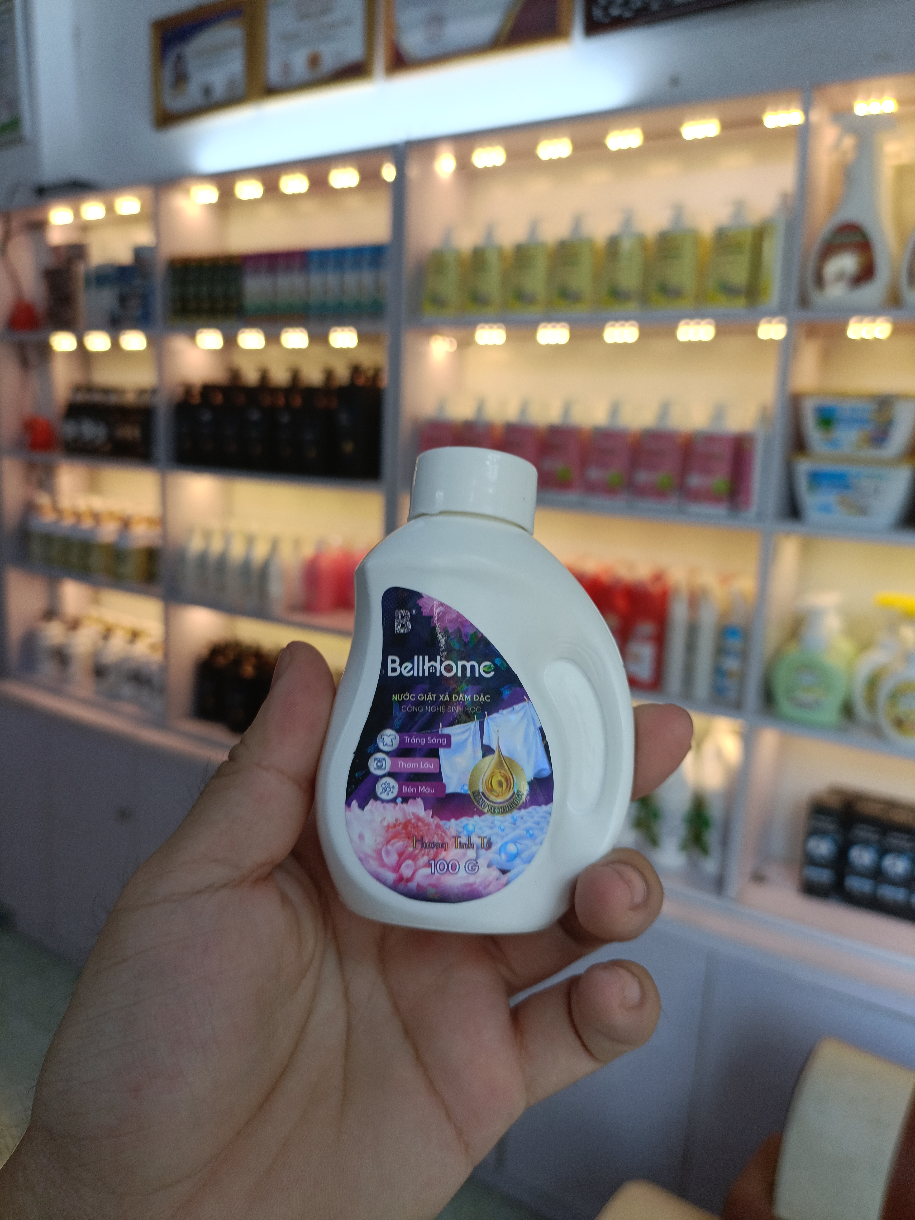 Nước Giặt Xả Công Nghệ Sinh Học Bell Home - Ra Mắt Sản Phẩm Tiên Phong Ứng Dụng Công Nghệ Sản Xuất Nước Hoa Trong Nước Giặt ĐẶC ĐIỂM NỔI BẬT CỦA NƯỚC GIẶT SINH HỌC CAO CẤP BELL HOME 100G Chiết xuất từ 20 đến 30 loại hương hoa trái quả, tạo nên tầng tầng lớp lớp hương Mỗi hương thơm trong nước giặt công nghệ sinh học Bell Home được chiết xuất từ 20 đến 30 loại hương hoa trái quả và tạo nên tầng tầng lớp lớp hương. Có thể cảm nhận được mùi hoa lan, hoa hồng, hoa huệ, hoa oải hương rồi hoa đào và các loại hoa trong cùng 1 sản phẩm. Hương thơm là dạng Flavor, dạng mùi thơm trong thực phẩm Nước giặt sinh học Bell Home với chiết suất nhiều bọt từ quả bồ hòn, rất thiên nhiên và làm sạch quần áo hiệu quả. Ngoài ra, hương thơm trong nước giặt sử dụng dạng Flavor, dạng mùi thơm dùng trong thực phẩm nên rất an toàn, không gây dị ứng và ảnh hưởng hệ hô hấp. Công nghệ lưu hương nước hoa cao cấp sang trọng Công nghệ hương đa tầng tiên tiến trong sản xuất nước hoa áp dụng trong Nước giặt công nghệ sinh học Bell Home là được thừa hưởng từ Bell Flavors & Fragrances, công ty hàng đầu về hương liệu và chất thơm trên thế giới, là vị trí mà công ty đã đạt được gần 200 năm qua. Quần áo ngâm qua đêm không bị hôi thối, trời nồm không mùi khó chịu Nhờ ứng dụng công nghệ sinh học và khả năng lưu hương gần như tương đương với các sản phẩm nước hoa cao cấp sang trọng, nước giặt công nghệ sinh học Bell Home giúp quần áo ngâm qua đêm không bị hôi thối, trời nồm không mùi khó chịu. Chất bẩn gom lại 1 góc, hạn chế bám bẩn trở lại Nhờ ứng dụng công nghệ sinh học mà các chất bẩn sau khi giặt sẽ được gom thành 1 khối, hạn chế tình trạng bị bám bẩn trở lại Không bị thẩm thấu ngược nên sau khi giặt chất bẩn sẽ lắng xuống dưới, còn ở trên nước vẫn trong giúp áo trắng ko bị bẩn, ố vàng. Chiết xuất từ vảy cá và ngọc trai, làm mềm và bảo vệ sợi vải Nhờ ứng dụng công nghệ lá sen với các hoạt chất được chiết xuất từ vảy cá và Ngọc trai, phủ trên bề mặt sẽ giúp bảo vệ quần áo, không bị sờn, không bị nhăn, không phai màu, thậm chí càng giặt càng sáng màu như mới. Công nghệ Nano vàng, Nano bạc giúp bảo vệ da tay, chống lão hóa, diệt khuẩn Công nghệ Nano vàng, nano bạc được áp dụng trong nước giặt Bell Home là công trình nghiên cứu khoa học của Viện nghiên cứu Nano và được thế giới công nhận, được cục sở hữu trí tuệ bảo vệ, cho tác dụng dưỡng da tay, mềm da tay, chống lão hóa da tay, sát khuẩn, diệt khuẩn và kháng khuẩn tuyệt vời. Chiết xuất thiên nhiên, an toàn cho da tay Nước giặt sinh học Bell Home triệt tiêu hoàn toàn phản ứng thủy sinh học vì chứa tinh dầu maca, tinh dầu hạnh nhân, tinh dầu dừa và tinh dầu cafe giúp bảo vệ da tay, dưỡng da, mềm da và trắng da, đảm bảo an toàn cho da tay, kể cả những làn da nhạy cảm nhất. Không gây tắc cống, bảo vệ môi trường Nhờ áp dụng công nghệ chiết xuất - dùng cồn thực phẩm để hòa tan sản phẩm lên đến 99% và công nghệ sinh học hữu cơ không hóa chất, nước thải sau khi giặt không gây tắc cống và có thể sử dụng để tưới cây, tưới rau… Nguồn gốc thực vật, an toàn cho người sử dụng Sản phẩm có đầy đủ hồ sơ giấy tờ nguyên vật liệu với nguồn gốc từ thực vật, có dấu chứng nhận của Sở thương mại Đức, đã được kiểm nghiệm trực tiếp và đạt tiêu chí cao trên vải lụa Hà Đông, với gốc tơ tằm thiên nhiên, khó tính mà không phải nước giặt nào cũng dùng được. THÔNG TIN CHI TIẾT SẢN PHẨM Tên sản phẩm: Nước Giặt Xả Công Nghệ Sinh Học Bell Home Thương hiệu: Bell Home Xuất xứ: Việt Nam Dung tích: 3,2 Kg Thành phần chính: Linear Alkylbenzene Sulphonic Acids, Sodium lauryl ether sulfate, Sodium hydroxide, Sodium sulfate, Natri Benzoate, Hydroxypropyl Cellulose, Hương thơm (Bồ Hòn, Nước Hoa…), Color… Mùi hương: Hương sang trọng, hương tinh tế, hương cuốn hút HƯỚNG DẪN SỬ DỤNG Đổ nước giặt vào nắp với liều lượng theo hướng dẫn. Thoa một lượng nhỏ nước giặt trực tiếp lên vết bẩn. Đổ phần nước giặt còn lại trong nắp vào máy giặt cùng với quần áo. Hướng dẫn bảo quản: Nơi thoáng mát, tránh ánh nắng trực tiếp CAM KẾT CỦA BELL HOME Bell Home - Sản phẩm chính hãng tốt nhất từ nhà máy của Tập đoàn Bell Việt Nam sở hữu toàn bộ khoa học công nghệ tiên tiến từ Đức, nguyên liệu nhập khẩu Đức với đầy đủ tiêu chuẩn chất lượng sẽ là sự lựa chọn thông minh để chăm sóc tổ ấm gia đình bạn