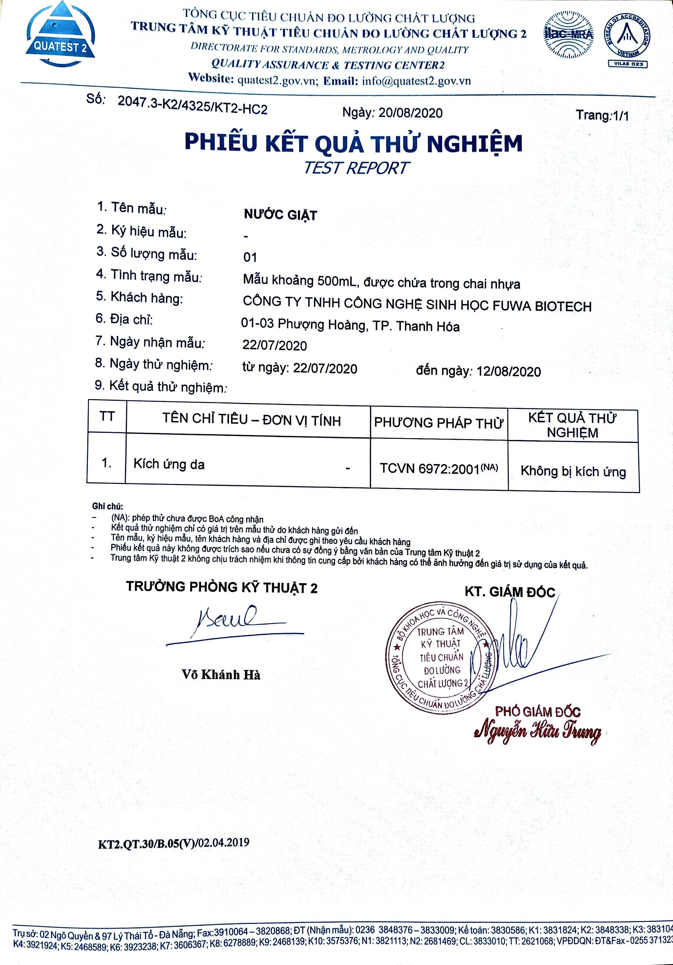 Nước giặt hữu cơ Fuwa3e ứng dụng công nghệ lên men vỏ dứa với Enzyme Bromelain có trong dứa có hoạt tính làm tan và tẩy sạch các vết bẩn. Sản phẩm không chứa hoá chất độc hại, chất tẩy trắng và hương liệu nên phù hợp giặt đồ cho trẻ sơ sinh, đồ lót, khăn. Sản phẩn đạt chuẩn không kích ứng da được kiểm định bởi Quatest 2. Một đặc điểm nổi bật của sản phẩm là nước thải sau khi giặt có thể dùng trực tiếp để tưới cây, các enzyme trong nước thải sẽ làm sạch đất và cung cấp thêm lợi khuẩn cho cây trồng.