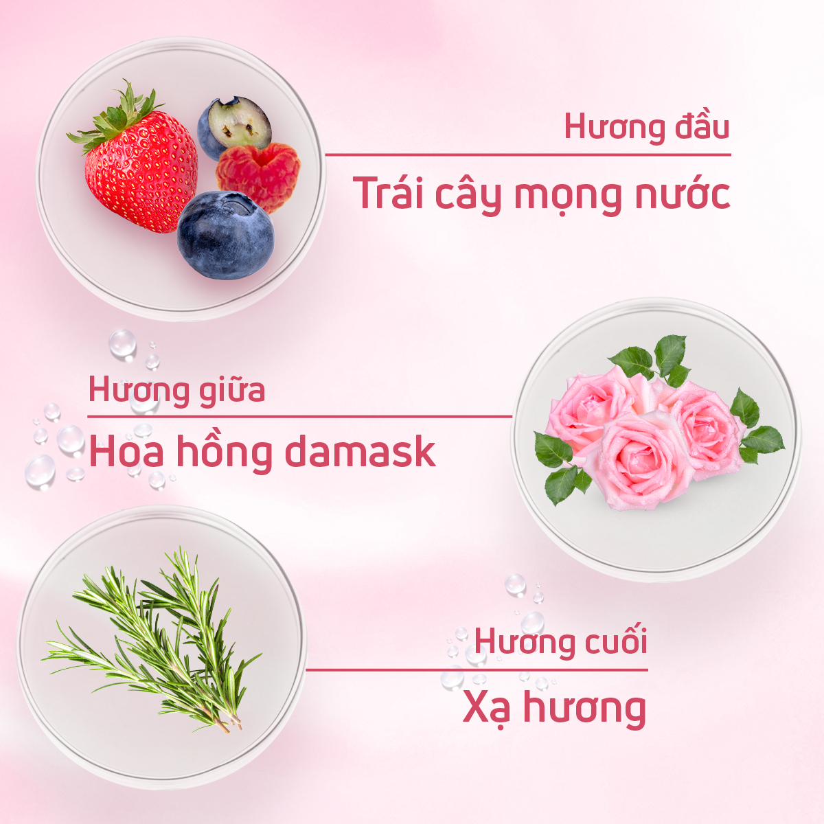 - Hương giữa: Hoa hồng Damas