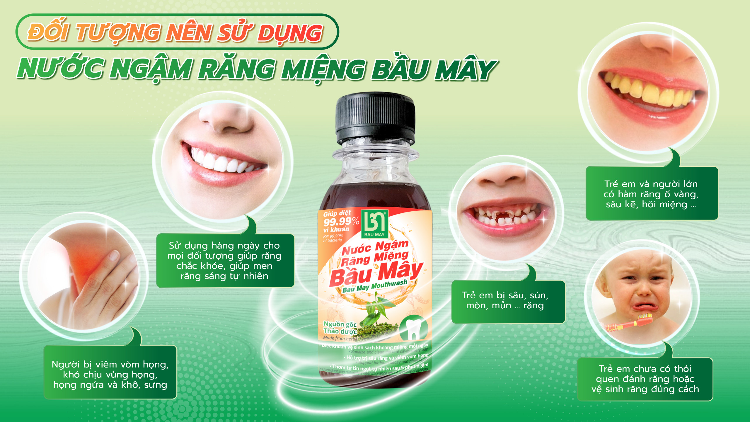Nước ngậm răng miệng Bầu Mây là sản phẩm được chế biến từ các thành phần tự nhiên như Tiêu Bầu Mây, nhụy tiêu, Hoài sơn Bầu Mây, rượu Hoài sơn Bầu Mây và cam thảo nam. Sản phẩm này không gây tác dụng phụ và có thể sử dụng trong vòng 5 năm kể từ ngày sản xuất.