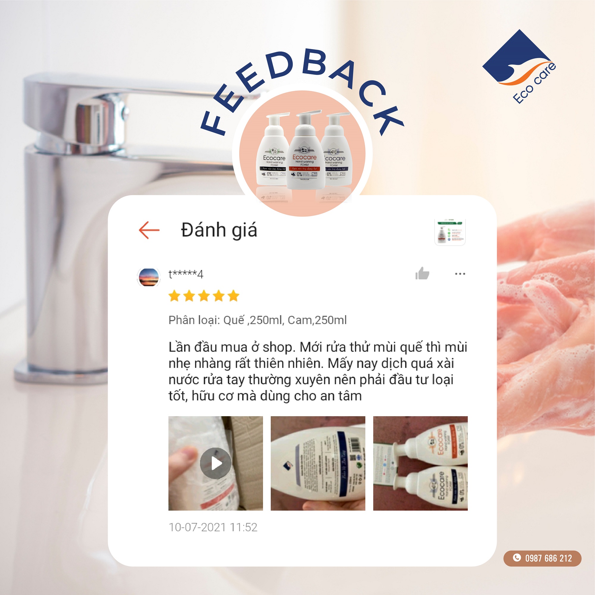 • Trước tiên, Công ty Ecocare xin cảm ơn Quý Khách hàng đã tin tưởng lựa chọn sản phẩm Nước rửa tay tạo bọt Hữu cơ Bồ hòn - Nước rửa tay diệt khuẩn tinh dầu Quế Ecocare