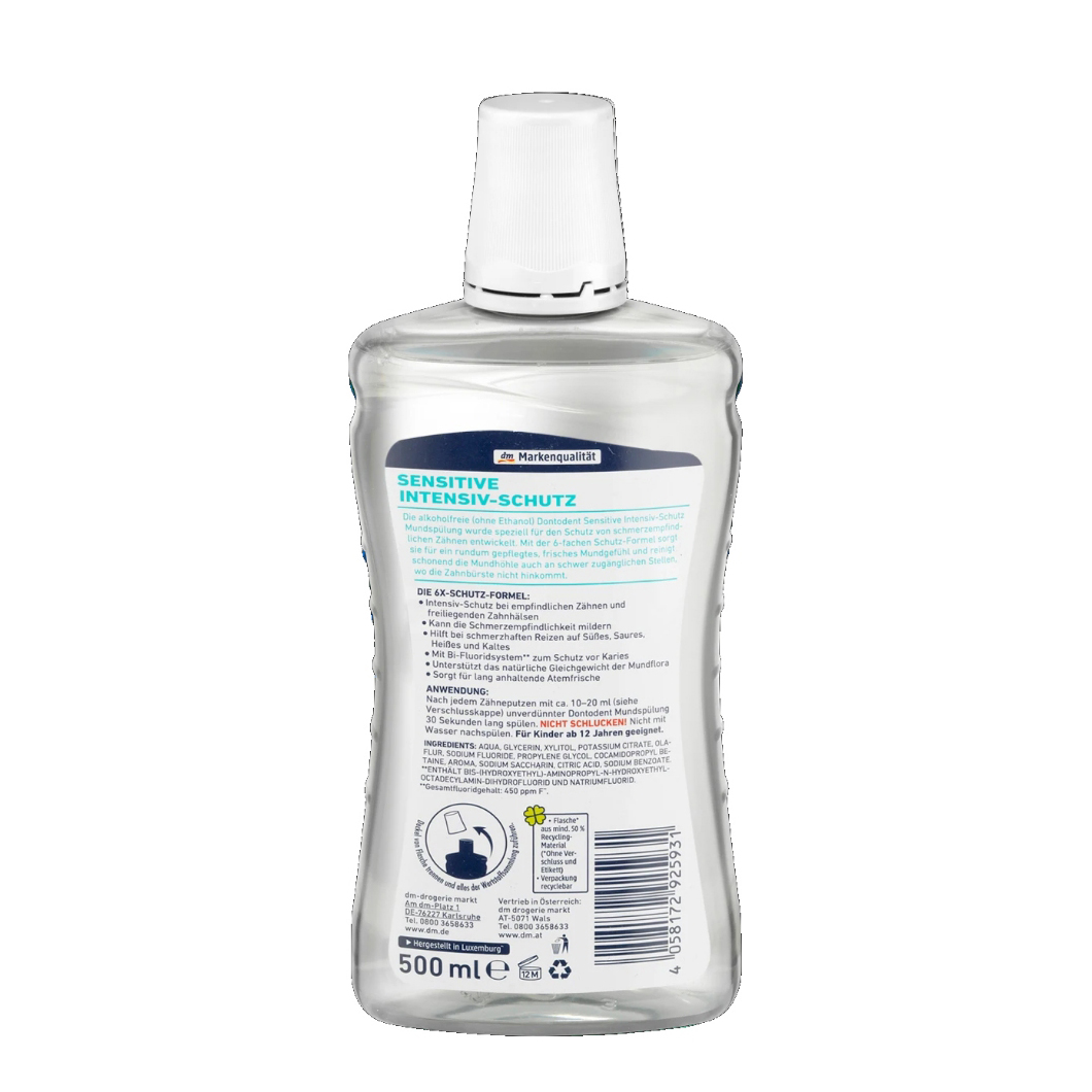 - Hơi thở thơm mát lâu dài. Nước súc miệng Dontodent không chứa cồn (không chứa ethanol) Protect&Care 10 trong 1 bảo vệ toàn diện được phát triển đặc biệt để vệ sinh toàn diện toàn bộ khoang miệng. Với công thức bảo vệ toàn diện gấp 10 lần, nó đảm bảo cảm giác miệng được chăm sóc kỹ lưỡng, cực kỳ thơm mát và làm sạch khoang miệng ngay cả ở những nơi khó tiếp cận mà bàn chải đánh răng không thể chạm tới. **Chứa bis(hydroxyethyl)aminopropyl-N-hydroxyethyloctadecylamine dihydrofluoride và natri florua. Tổng hàm lượng florua: 450 ppm F-. Antibakteriellei :