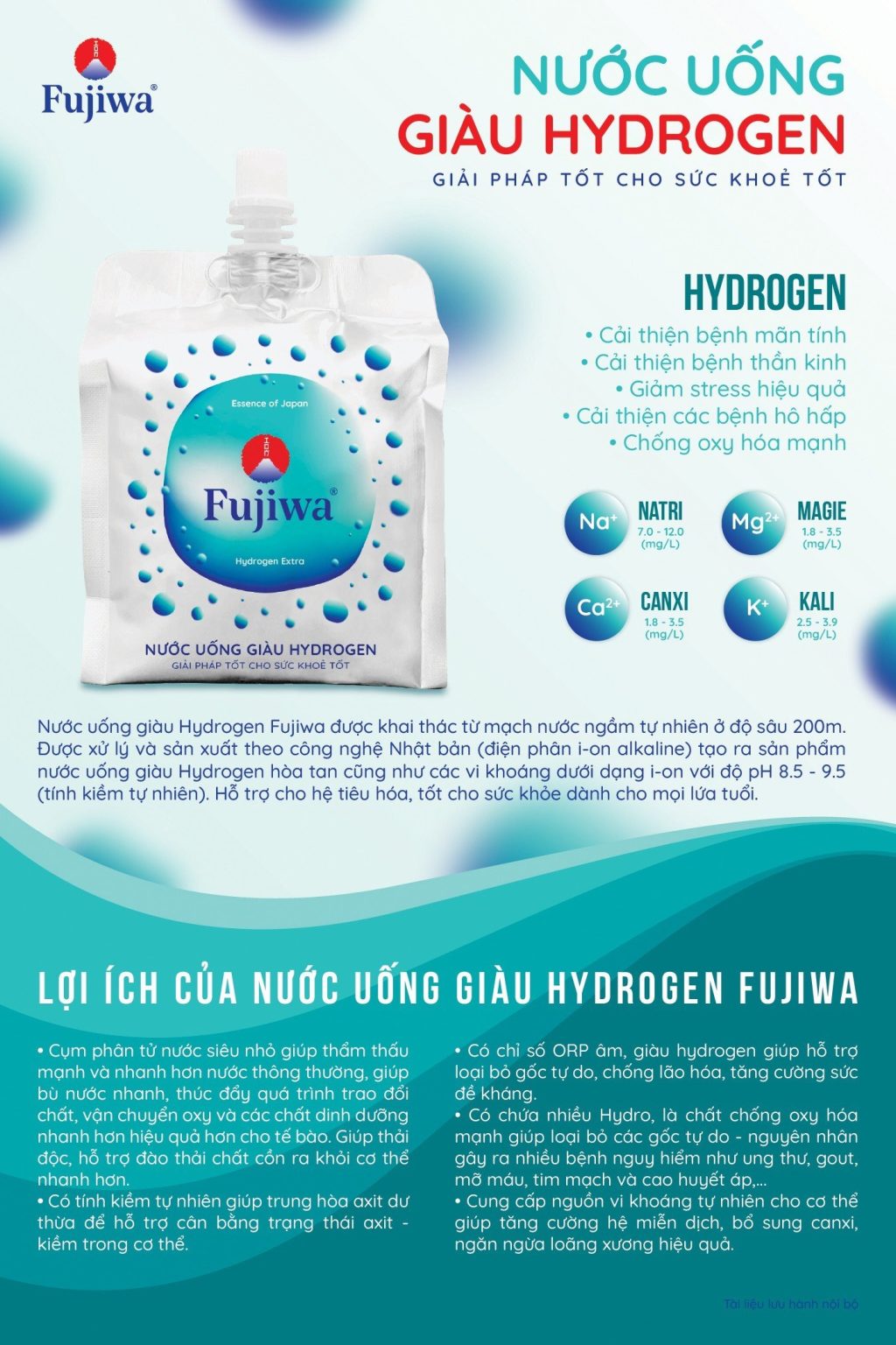 Mua tại TiktokMô tả Nước uống giàu Hydrogen Fujiwa được khai thác mạch nước ngầm tự nhiên độ sâu 200m, được xử lý và sản xuất theo công nghệ Nhật Bản (điện phân i-on Alkaline) tạo ra sản phẩm nước uống thành phần chính giàu Hydrogen hòa tan, chỉ số ORP âm, các vi khoáng dưới dạng i-on với độ pH 8.5 ~9 (tính kiềm tự nhiên), ĐẶC TÍNH