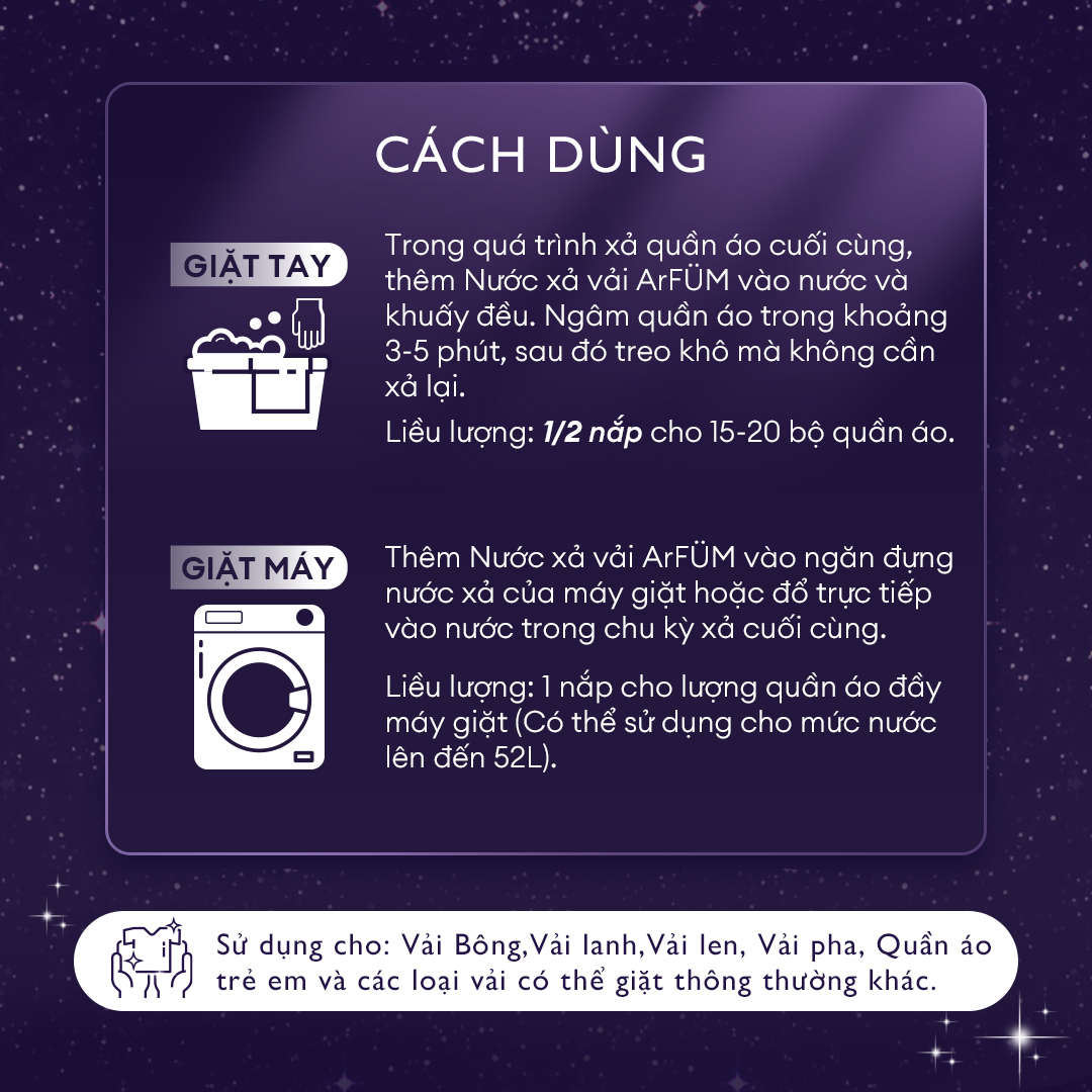 Trong quá trình xả quần áo cuối cùng, thêm Nước xả vải Ar FÜM vào nước và khuấy đều. Ngâm quần áo trong khoảng 3-5 phút, sau đó treo khô mà không cần xả lại.