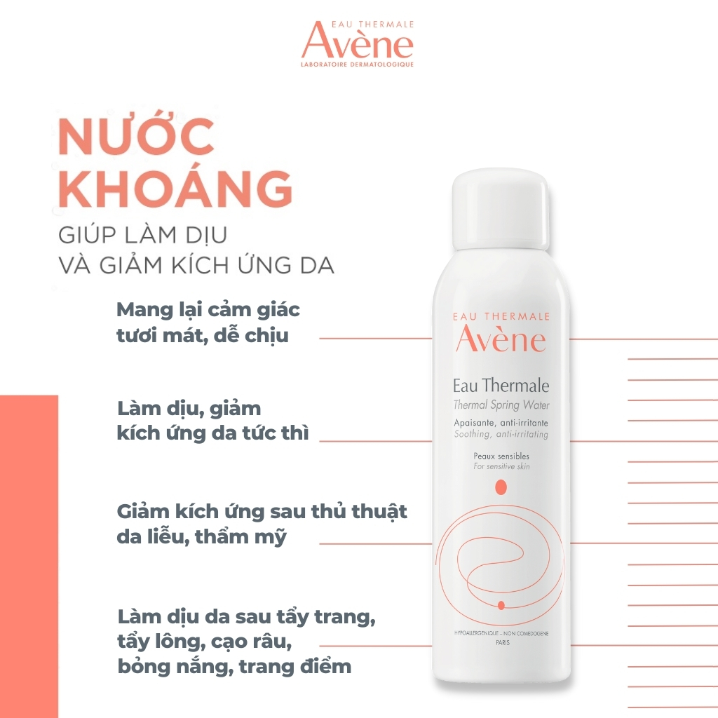 GIỚI THIỆU Nước khoáng Avène làm dịu, giảm kích ứng Avène Thermal Spring Water được đóng chai trực tiếp tại nguồn, trong điều kiện vô trùng, bảo toàn mọi đặc tính làm dịu da. Sản phẩm dạng phun sương cung cấp nước làm dịu da, chăm sóc và dưỡng ẩm cho da, giúp da của bạn luôn mềm mịn tự nhiên. Nước khoáng Avène có hơn 150 nghiên cứu lâm sàng và báo cáo khoa học về an toàn và hiệu quả trong chăm sóc da. THÔNG TIN SẢN PHẨM THÀNH PHẦN: