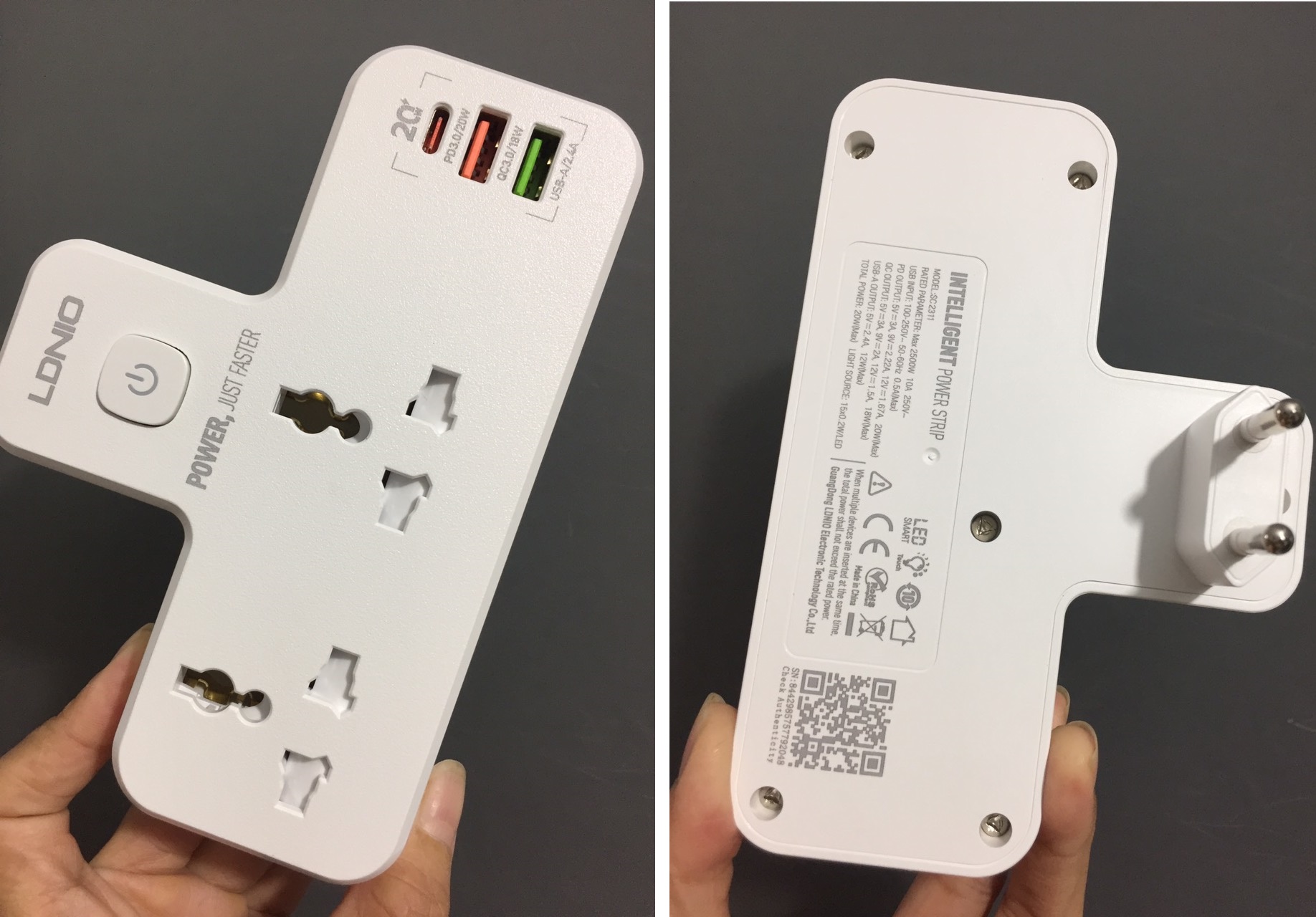 - Sạc 1 cổng: 5V-2.4A *Sạc 2 cổng: 12W Max -1 USB QC3.0 (Màu đỏ): 5V-3A 9V-2A 15V-1.5A -1 cổng type-C PD20W : 5V-3A 9V=2.22A 12V1.67A