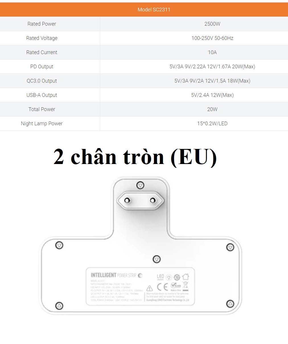 - Input: 100-250V / 10A *Chân cắm: 2 chân tròn (EU)