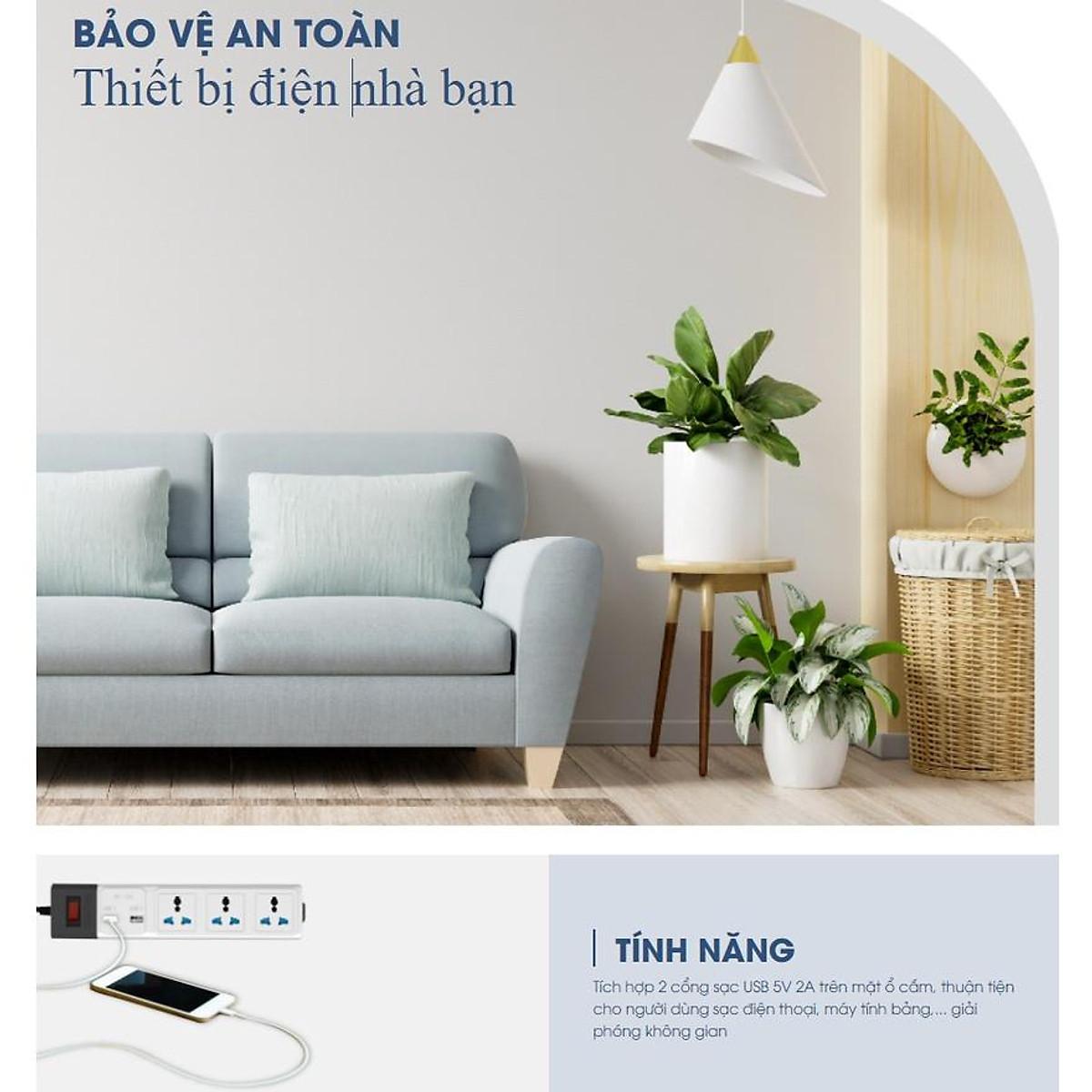 Ổ cắm 3 ổ đa năng + 2 ổ cắm USB cách điện bền đẹp - Chịu nhiệt, chống cháy: 750 độ C - Chiều dài dây điện: 1.8 mét - Chân tiếp xúc với