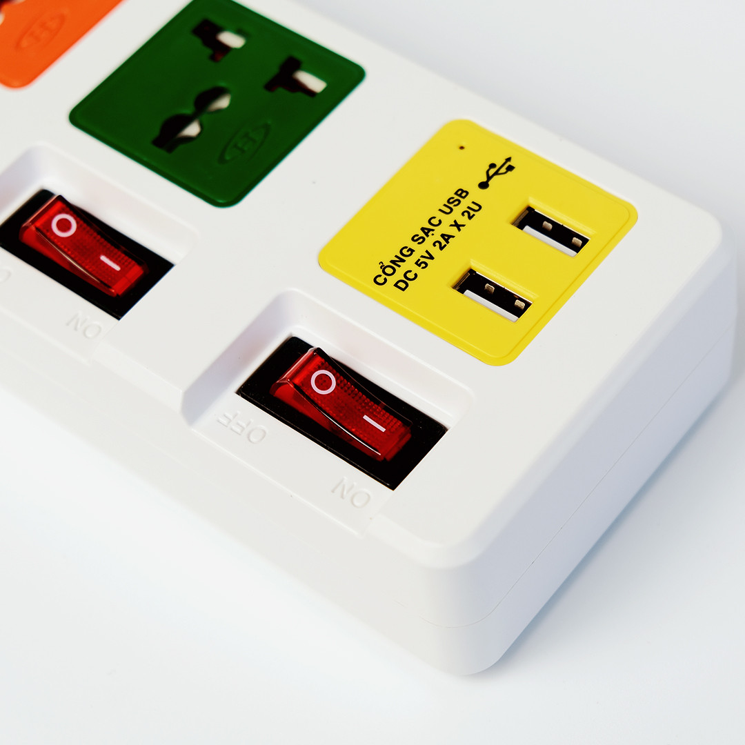 Ổ cắm 3 ổ đa năng + 2 ổ cắm USB cách điện bền đẹp - Chịu nhiệt, chống cháy: 750 độ C - Chiều dài dây điện: 1.8 mét - Chân tiếp xúc với
