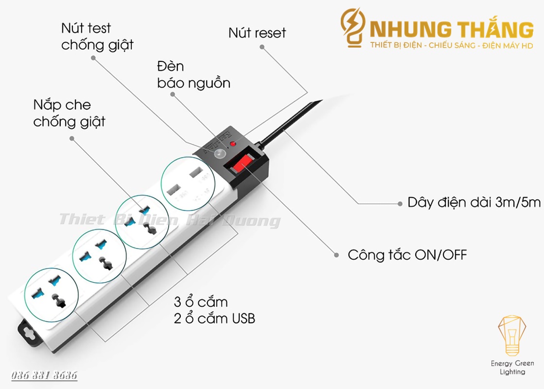Ổ cắm nối dài đa năng cao cấp Dây dẫn ĐỒNG NGUYÊN CHẤT, ĐÚNG TIẾT DIỆN 100% Bảo vệ quá tải bằng công tắc tự động (MINI CB) Tiếp điểm sử dụng nguyên liệu đồng