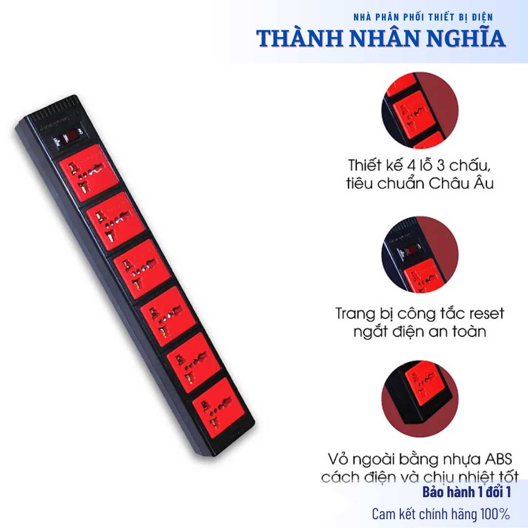 - Bảo vệ an toàn chống xung điện áp cao, xung sét. - Công tắc tích hợp rơ le chống quá tải 15A. - Ổ cắm đa năng sử dụng đồng chuyên dụng siêu đàn