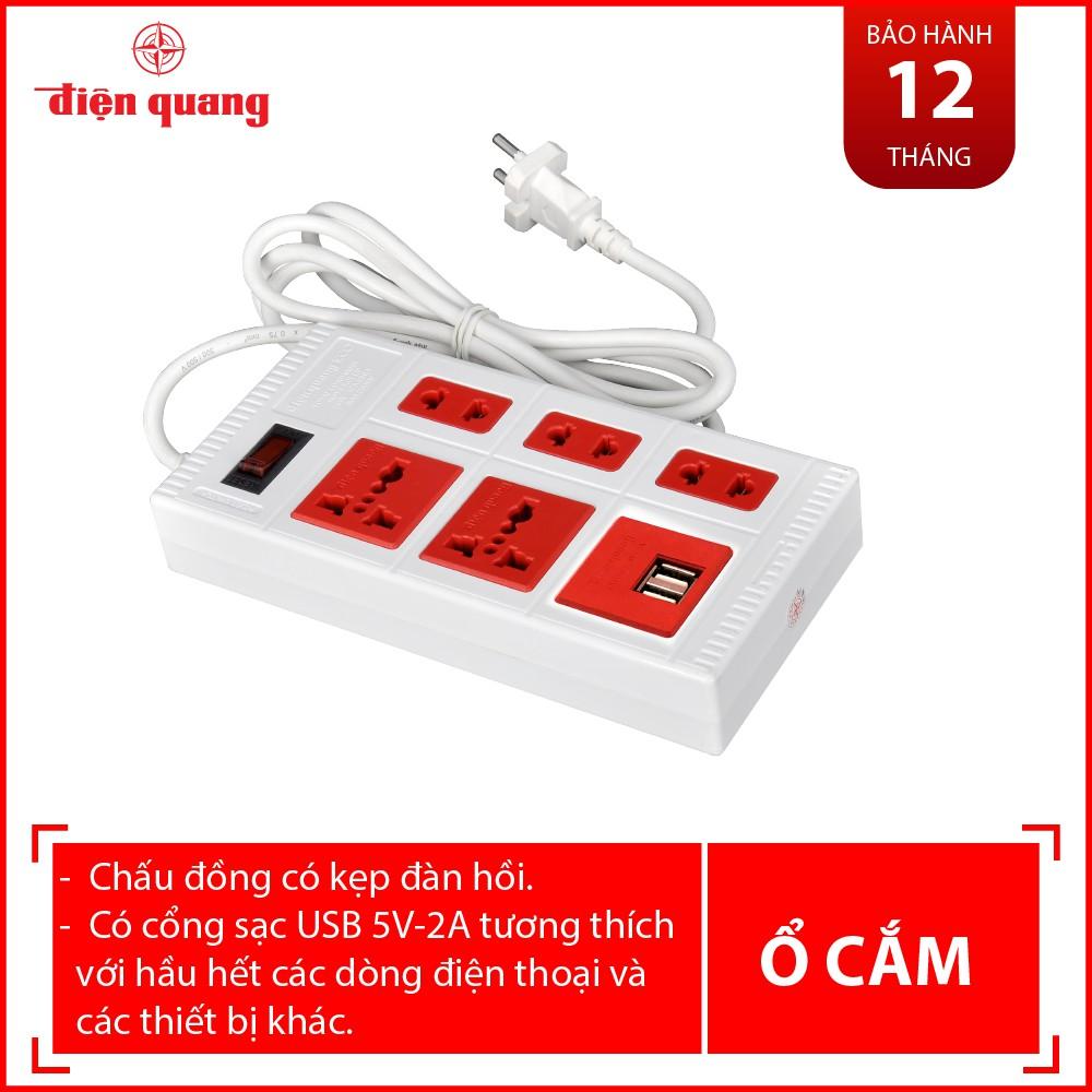 Ổ cắm điện chính hãng Điện Quang chất lượng uy tín miễn bàn - dây 2 mét, 5 lỗ, 2 cổng sạc USB