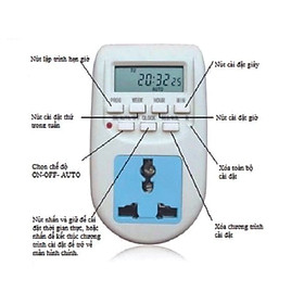 ùy chọn được các chế độ ON / OFF / AUTO Có pin chờ khi mất điện với thời gian chờ lên đến 100 giờ. Sử dụng cho thiết bị điện , vd: hẹn giờ cho bình nước nóng tự động bật vào lúc 6g & tắt lúc 6g30 hàng ngày, luôn có nước nóng cho ta rửa mặt buổi sáng , tiết kiệm điện ,không phải bật suốt...
