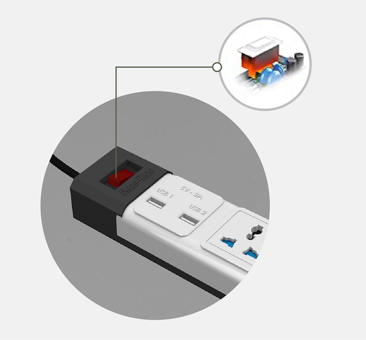 Ổ cắm 3 ổ đa năng + 2 ổ cắm USB cách điện bền đẹp - Chịu nhiệt, chống cháy: 750 độ C - Chiều dài dây điện: 1.8 mét - Chân tiếp xúc với