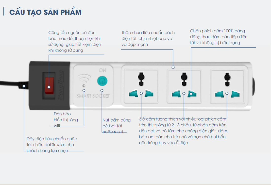 Dải điện áp hoạt động: (150-250)V/50Hz Dòng điện ổ cắm tối đa: 10A Công suất ổ cắm tối đa: 2500W Số chu kỳ bật tắt: 100.000 lần Dải nhiệt độ hoạt động: (-10-45)°C Kích thước