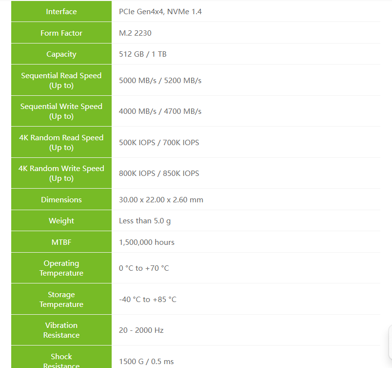 Thông số kỹ thuật Kiểu ổ cứng SSD Màu sắc của ổ cứng Xanh lá Cấu hình chi tiết Dung lượng 500GB Kết nối PCIe Bộ nhớ NAND Không Kích thước M.2 2280 Tốc độ