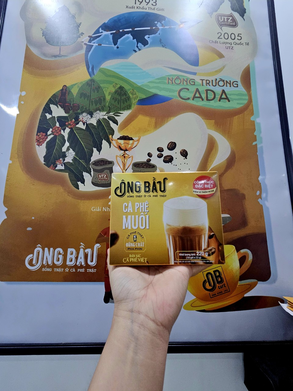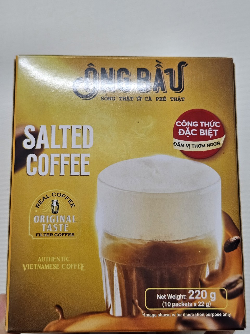 Với sản phẩm tươi sống, trọng lượng thực tế có thể chênh lệch khoảng 10%. Cà Phê Ông Bầu thương hiệu được thành lập với mục đích mang lại giá trị thật cho hạt cà phê Việt Nam. Giá trị ở đây không chỉ về kinh tế, mà còn là chất lượng sản phẩm. Góp phần chung tay tạo nên những bước phát triển bền vững cho hạt cà phê Việt Nam. Cà Phê Muối Ông Bầu sản phẩm thơm vị cà phê đậm đà vị muối khối lượng tịnh 220g (10 gói x 22g) Đậm đà bản sắc cà phê Việt Cà phê muối (salt coffee) là thức uống kết hợp từ cà phê, sữa tươi lên men, sữa đặc và muối. Vị mặn của muối tưởng chừng như khá mới lạ nhưng lại giúp cà phê càng nồng nàn, sữa càng trở nên thơm béo hơn. Khi thưởng thức, bạn sẽ cảm nhận được sự hoà quyện tuyệt vời như chính tay bạn đang pha thủ công vậy. Nhưng, chỉ cần 30s là đã có ngay ly cà phê muối thơm ngon.