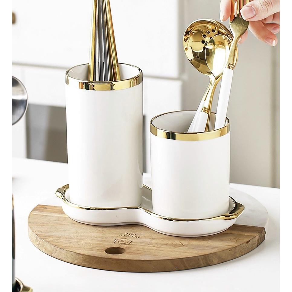 ✨ỐNG ĐỰNG THÌA ĐŨA ĐÔI KHÈM KHAY BẰNG SỨ VIỀN VÀNG PHONG CÁCH BẮC ÂU SANG TRỌNG