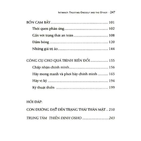 - Cải Tạo Tâm Hồn: Osho khuyên rằng để có thể thực sự thân mật và sống trong yêu thương, trước tiên chúng ta phải thanh lọc tâm trí, giải phóng khỏi những vướng bận và những lớp bảo vệ mà mình xây dựng trong suốt cuộc đời. Thiền và sự tĩnh lặng của tâm hồn là con đường dẫn tới sự cởi mở và thân mật không sợ hãi.