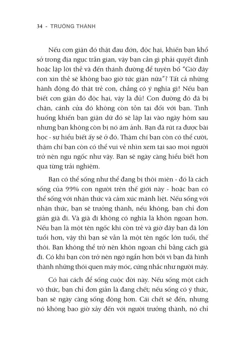 Ai trong chúng ta rồi cũng sẽ già đi, nhưng không phải ai cũng sẽ trưởng thành. “Thông thường, bạn chỉ già đi, bạn không trưởng thành. Già đi là một chuyện, trưởng thành là chuyện hoàn toàn khác”, Osho lý giải. Lão hoá chính là sự già đi của cơ thể, và lúc này, “cả cuộc đời bạn chỉ có một cái chết chậm rãi, kéo dài”. Do vậy mà hầu như ai cũng tránh né quá trình này dù đó là điều bất khả. Trong khi đó, trưởng thành là sự phát triển của nội tâm mà khi đó, bạn sống với nhận thức và cảm xúc mãnh liệt trong mọi khoảnh khắc. Chính xác trưởng thành là gì, và làm thế nào để trưởng thành chính là nội dung cốt lõi mà cuốn sách “Trưởng thành” sẽ đem đến cho bạn đọc.