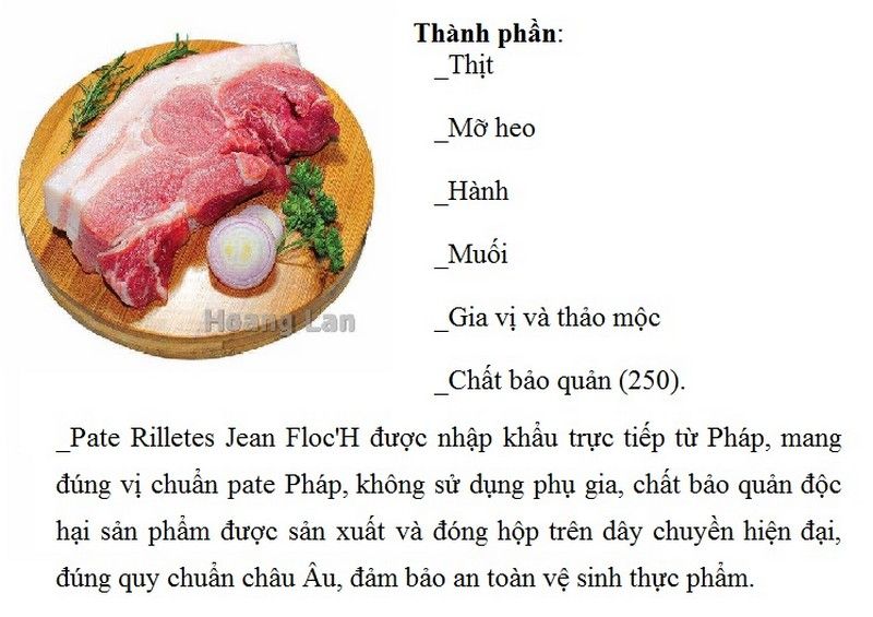 Mua tại TiktokPate thịt sợi Rilletes Jean Floch 125g - Pháp _Pate thịt sợi hiệu Jean Floc’H chế biến từ thịt và gan của những chú heo được chăm sóc cẩn thận theo quy trình chăn nuôi dựa vào hạt lanh-giàu Omega 3 của Hiệp hội Bleu Blanc Coeur _Pate Rilletes Jean Floc'H được nhập khẩu trực tiếp từ Pháp, mang đúng vị chuẩn pate Pháp, không sử dụng phụ gia, chất bảo quản độc hại sản phẩm được sản xuất và đóng hộp trên dây chuyền hiện đại, đúng quy chuẩn châu Âu, đảm bảo an toàn vệ sinh thực phẩm.