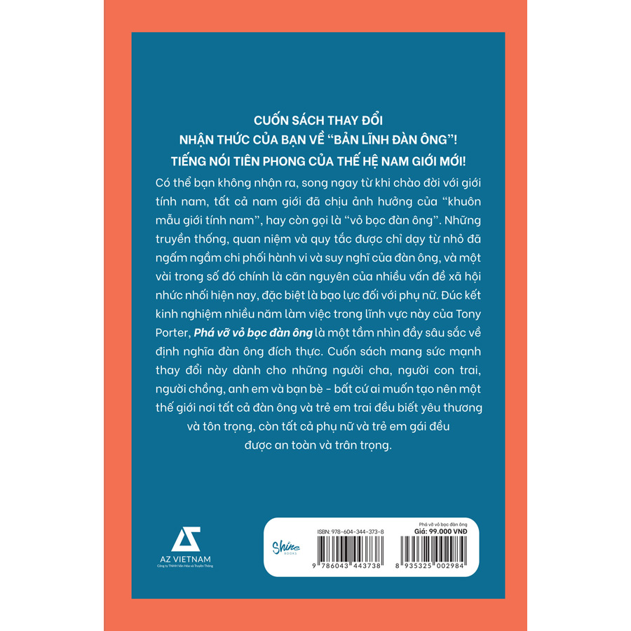 Có thể bạn không nhận ra, song ngay từ khi chào đời với giới tính nam, tất cả nam giới đã chịu ảnh hưởng của “khuôn mẫu giới tính nam”, hay còn gọi là “vỏ bọc đàn ông”. Những truyền thống, quan niệm và quy tắc được chỉ dạy từ nhỏ đã ngấm ngầm chi phối hành vi và suy nghĩ của đàn ông, và một vài trong số đó chính là căn nguyên của nhiều vấn đề xã hội nhức nhối hiện nay, đặc biệt là bạo lực đối với phụ nữ. Đúc kết kinh nghiệm nhiều năm làm việc trong lĩnh vực này của Tony Porter, Phá vỡ vỏ bọc đàn ông là một tầm nhìn đầy sâu sắc về định nghĩa đàn ông đích thực. Cuốn sách mang sức mạnh thay đổi này dành cho những người cha, người con trai, người chồng, anh em và bạn bè - bất cứ ai muốn tạo nên một thế giới nơi tất cả đàn ông và trẻ em trai đều biết yêu thương và tôn trọng, còn tất cả phụ nữ và trẻ em gái đều được an toàn và trân trọng.