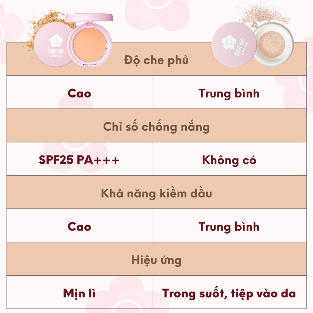 VÌ SAO BẠN SẼ CHỌN PHẦN PHỦ DẠNG BỘT TƠI DAISY DOLL? SỞ HỮU 3 loại kết cấu mang đến “làn da ước mong”. Không có cảm giác trắng bệch hay bột phấn, tiệp vào