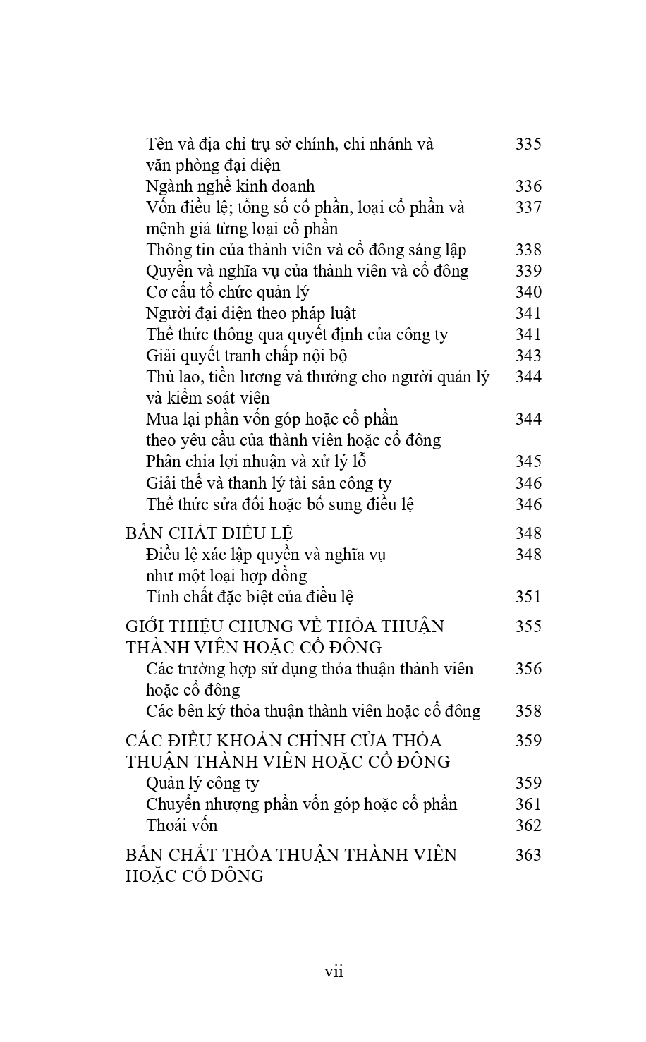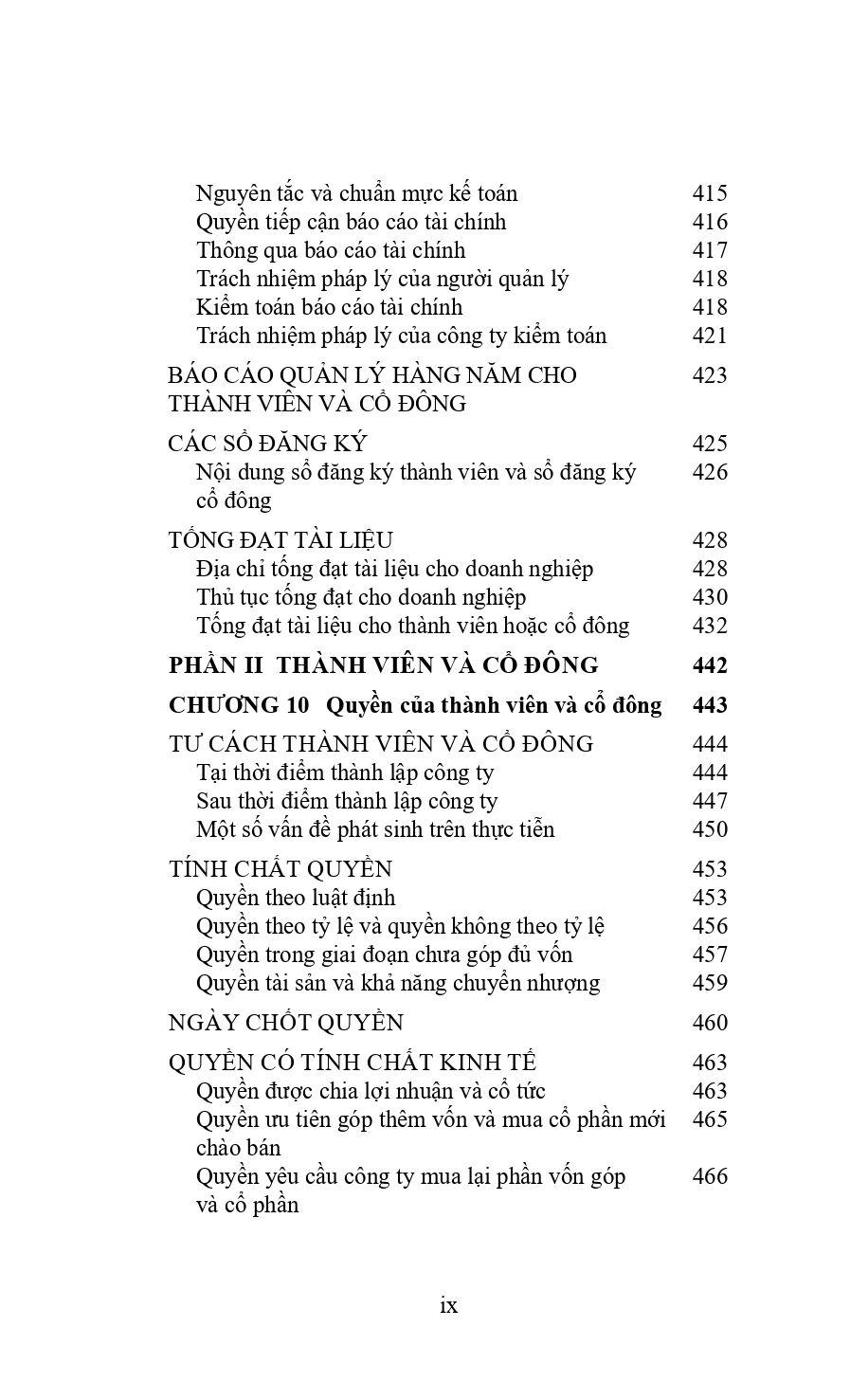 • Phần II (từ Chương 10 đến Chương 12) tập trung vào các vấn đề pháp lý liên quan đến tư cách và quyền của thành viên CTNHH và cổ đông CTCP.