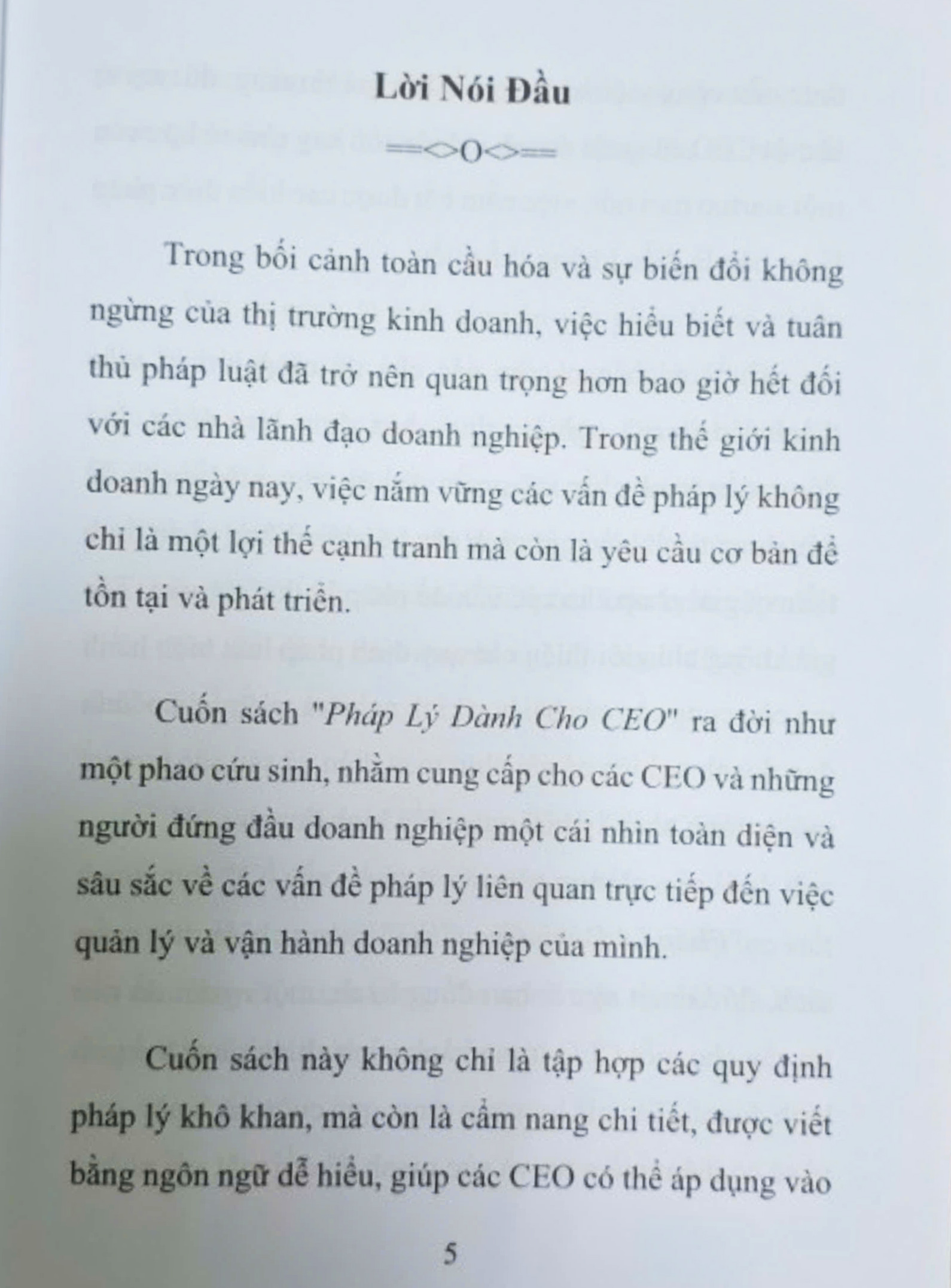 Cuốn sách "Pháp Lý Dành Cho CEO" ra đời như một phao cứu sinh, nhằm cung cấp cho các CEO và những người đứng đầu doanh nghiệp một cái nhìn toàn diện và sâu sắc về các vấn đề pháp lý liên quan trực tiếp đến việc quản lý và vận hành doanh nghiệp của mình.