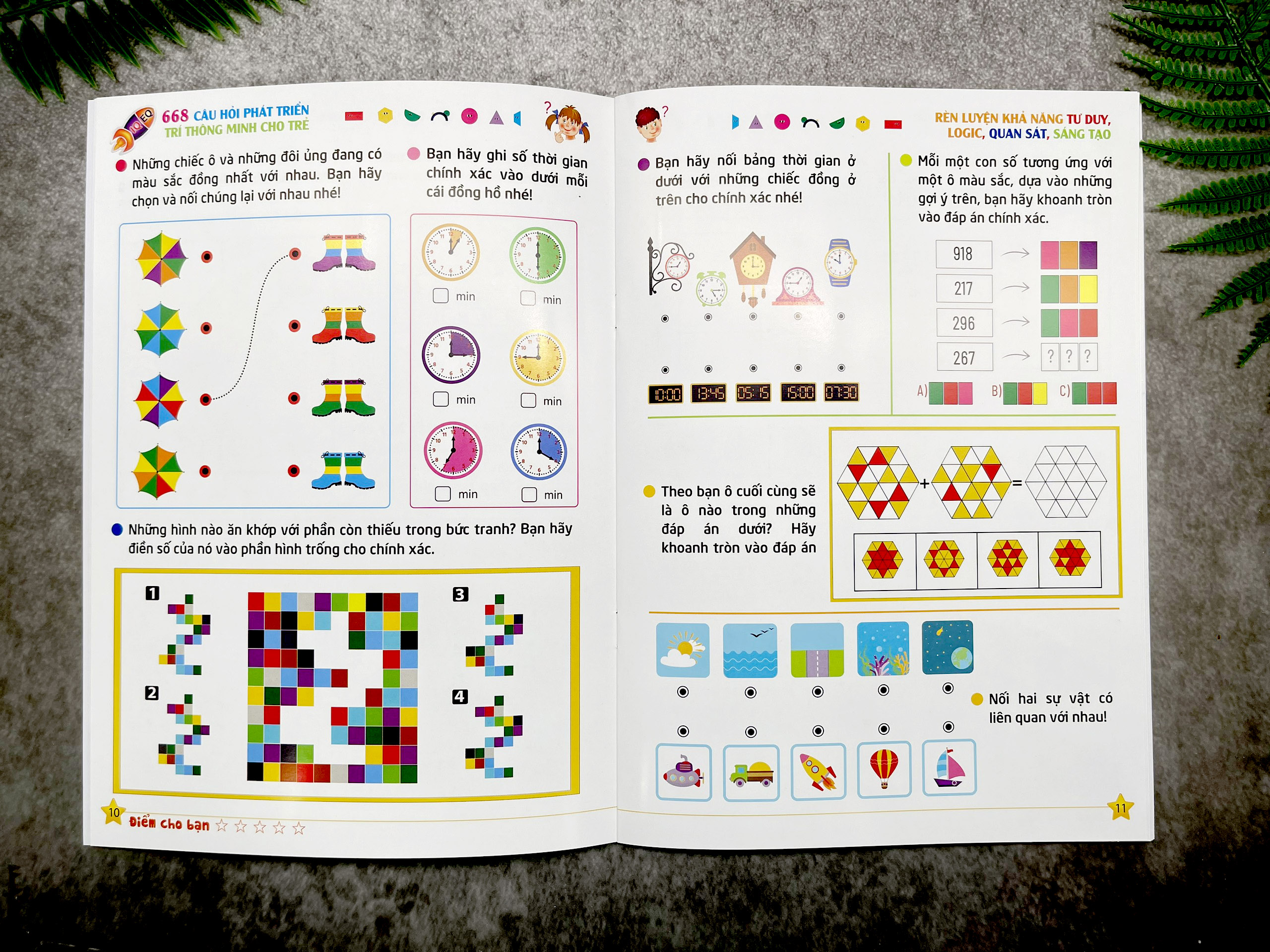 - Bộ Sách 668 Câu hỏi phát triển trí thông minh cho trẻ nhằm phát triển IQ,EQ, Cung cấp những trò chơi toán học úp trẻ phát huy tối đa khả năng nhận thức , tư duy phân kỳ , tưởng tượng, tri giác về không gian, phán đoán ,suy luận và thông minh cảm xúc giúp trẻ rèn luyện tư duy một cách toàn diện . Nhiều bài trong bộ sách được trang bị để có sự tương tác giữa bố mẹ và con cái , vừa nân cao năng lực tuy duy của mình vừa giúp trẻ phát triển các kỹ năng tư duy cần thiết để trẻ xây dựng kỹ năng , sự khéo léo , tính chính xác và rèn luyện độ kiên trì