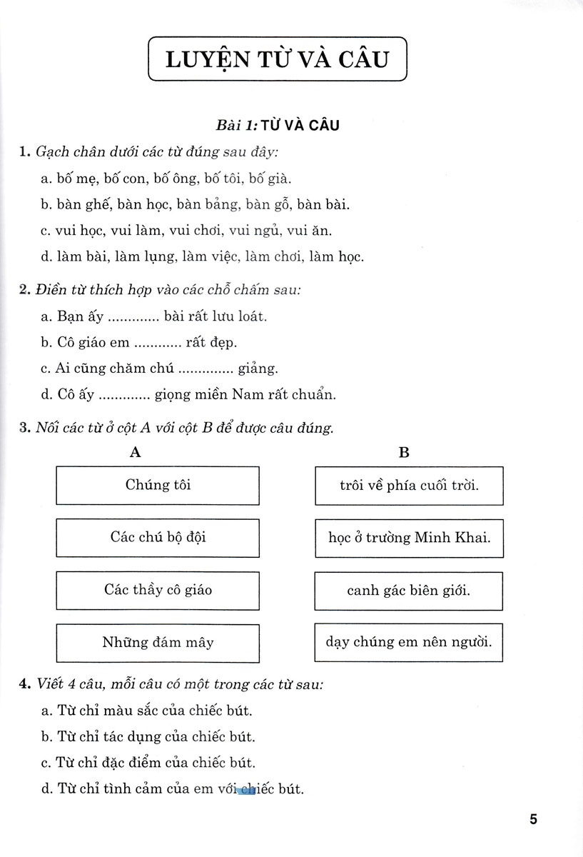 Cuốn sách gồm các bài tập Luyện Từ Và Câu, Tập Làm Văn, Đọc Hiểu và Chính Tả. Ở mỗi phần chúng tôi có đưa ra các dạng bài theo từng tiết học có kết hợp cả phần trắc nghiệm và tự luận nhằm giúp các em có thể tự làm bài một cách dễ dàng nhất. Phần cuối là một số đề kiểm tra giúp các em học sinh tự kiểm tra kiến thức của mình.