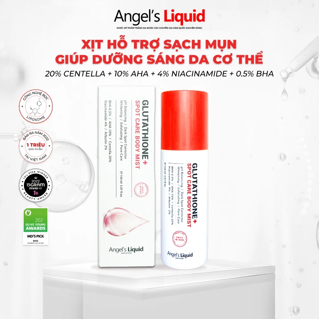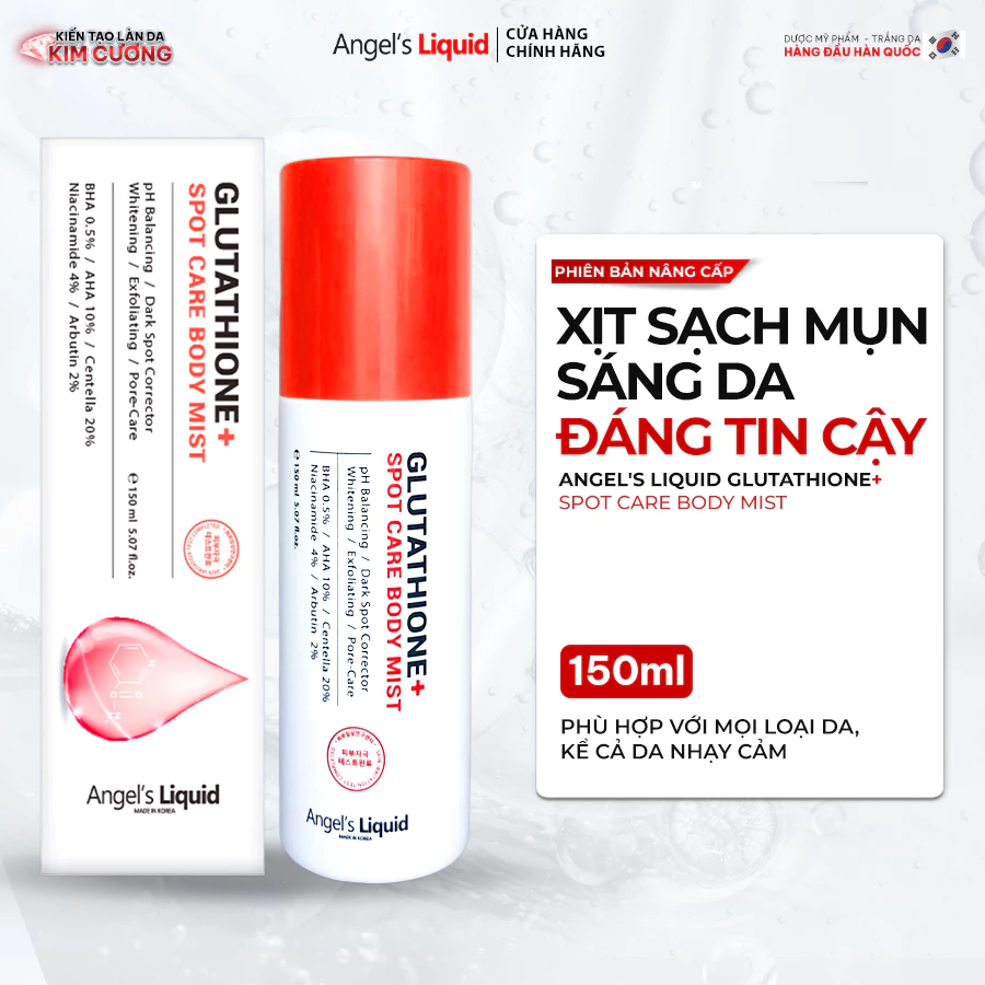 Xịt sạch mụn, sáng da body đáng tin cậy Angel's Liquid Glutathione+ Spot Care Body Mist 150ml - phiên bản xịt body dược mỹ phẩm đầu tiên mới nâng cấp, được ra mắt với mục tiêu mang đến một giải pháp hỗ trợ sạch mụn, mờ thâm, trắng da và ngăn ngừa mụn cơ thể tái phát tối ưu hơn với độ tin cậy cao hơn nhờ sự nghiên cứu kỹ lưỡng của các chuyên gia da liễu hàng đầu Hàn Quốc.