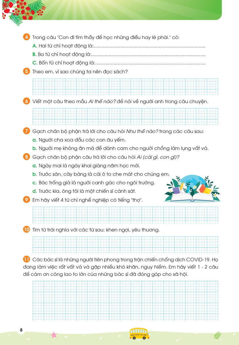 Sách được thiết kế với những hình ảnh mô tả thú vị, bắt mắt, giúp tạo sự thích thú và tương tác tích cực trong quá trình học. Những hình ảnh này không chỉ làm cho sách trở nên sinh động mà còn giúp các em nhận biết và áp dụng kiến thức một cách dễ dàng.