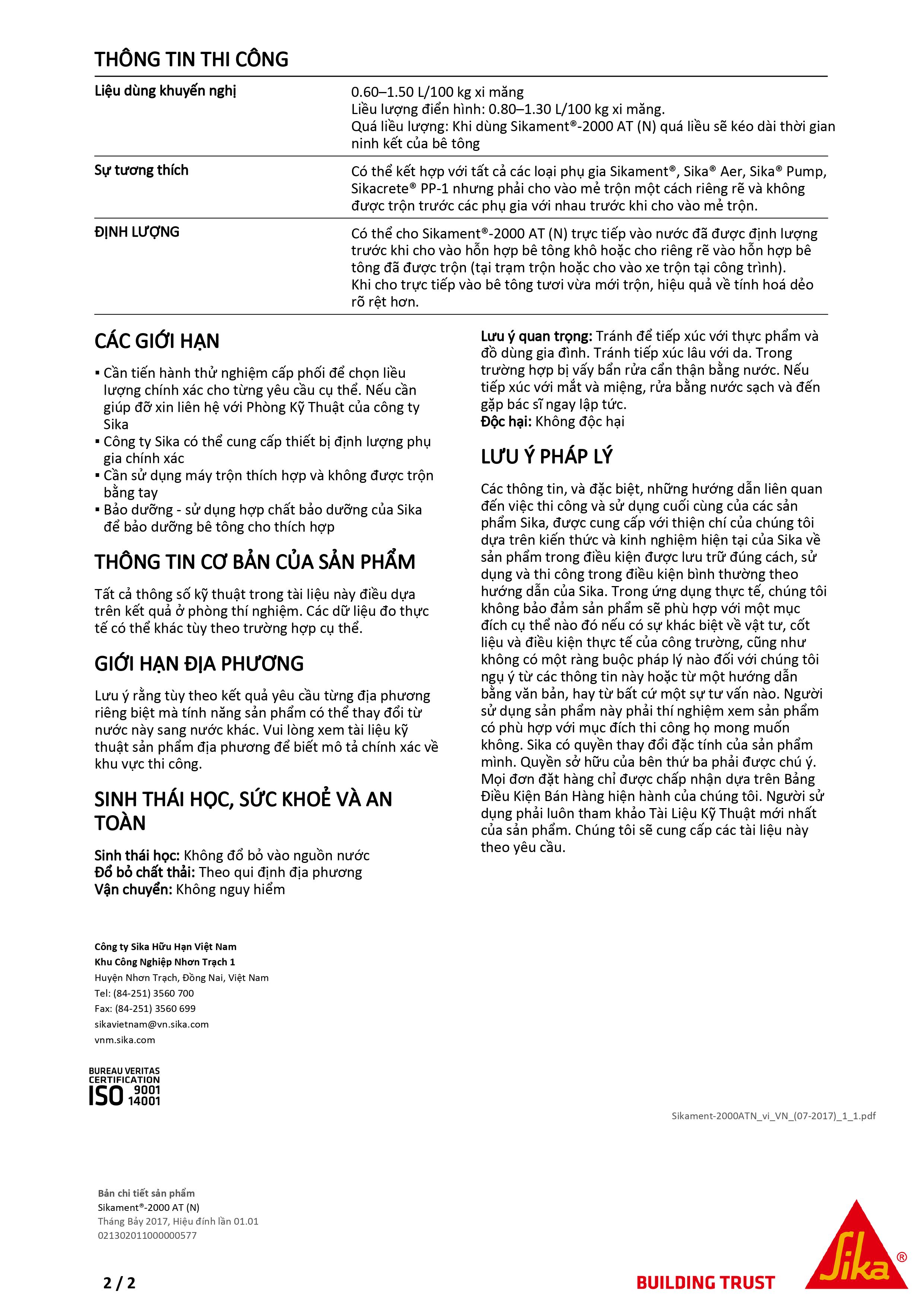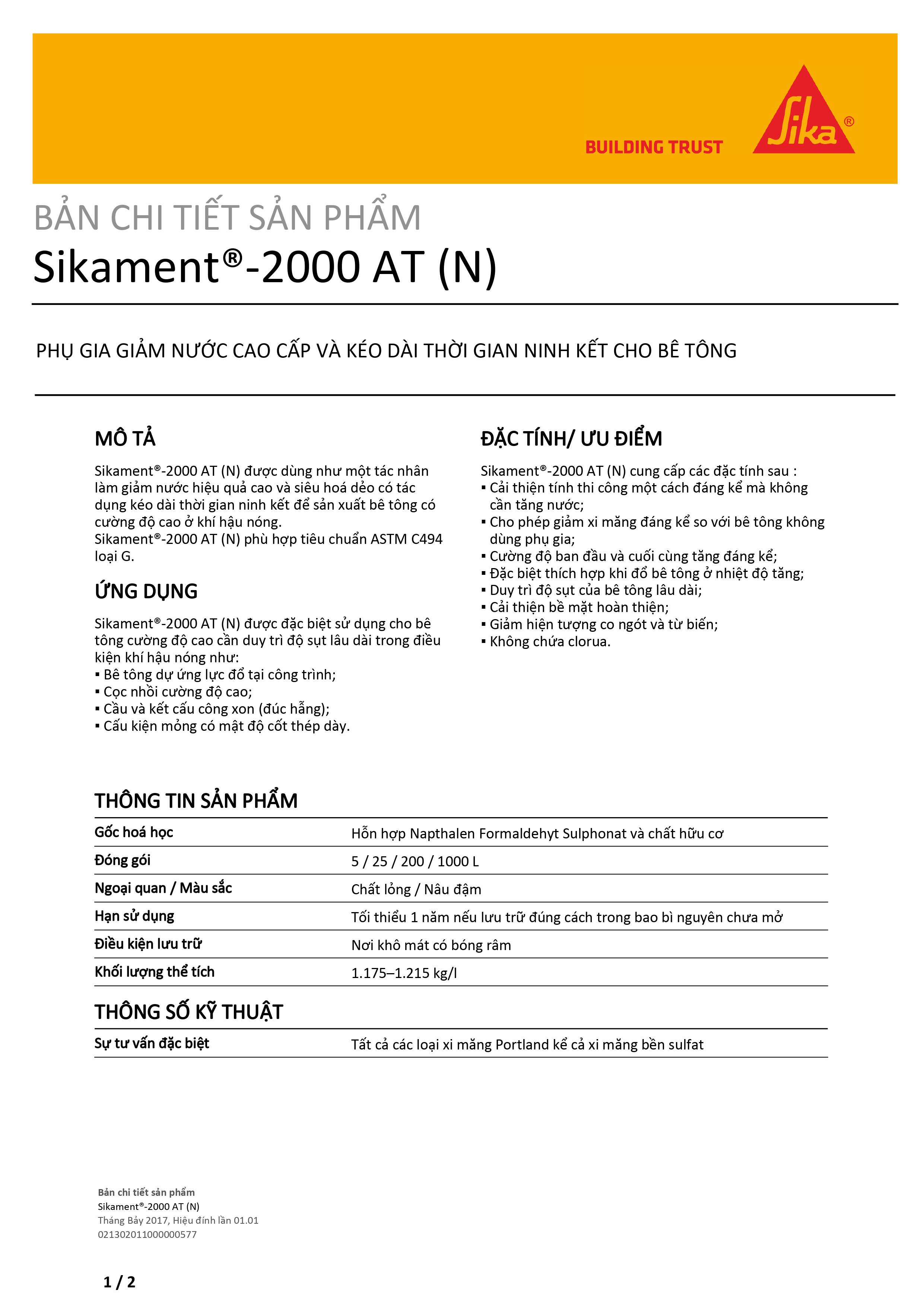 Mô tả: Sikament-2000 AT được dùng như một tác nhân làm giảm nước hiệu quả cao và siêu hoá dẻo có tác dụng kéo dài thời gian ninh kết để sản xuất bê tông có cường độ cao.