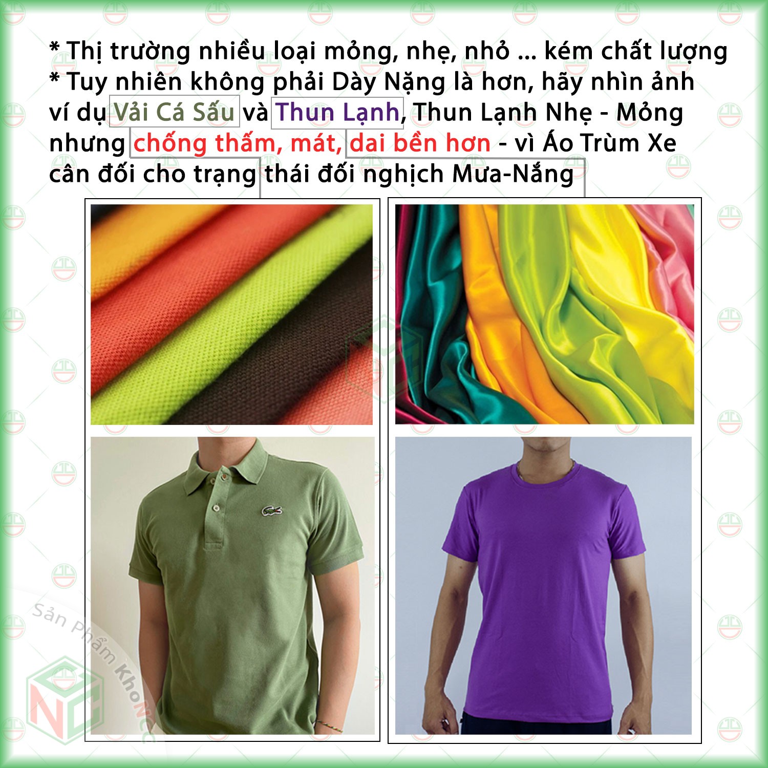 Áo Trùm Bạt Phủ Xe KhoNCC là Sản Phẩm Chất Liệu Vải Dù (Vải + Nylon chống thấm) , không như một số nơi khác cao cấp lắm là Vải Dù Áo Mưa, che xe trời nắng cực kỳ hại xe (trải nghiệm bằng cách Mặc Áo M...