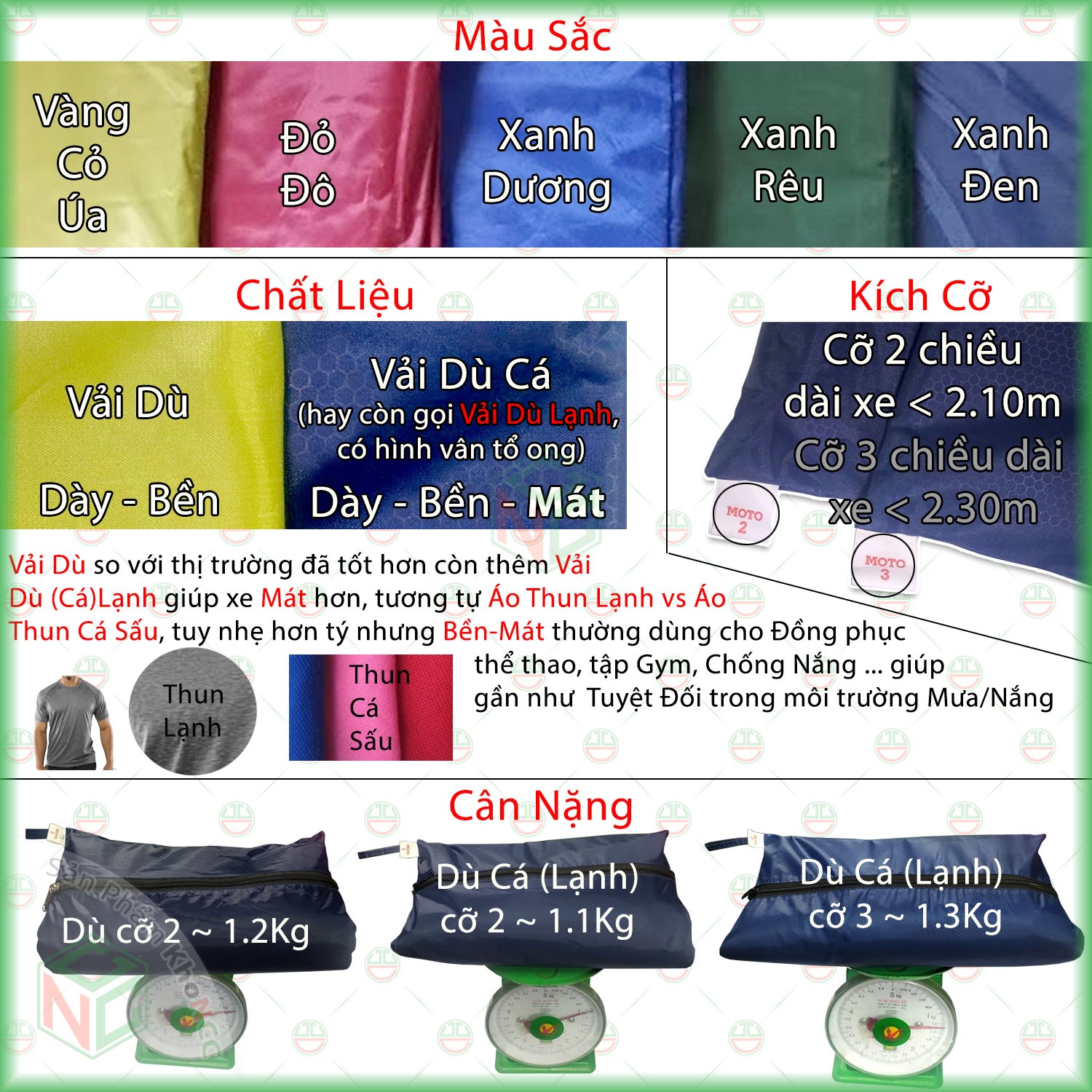 Áo Trùm Bạt Phủ Xe KhoNCC là Sản Phẩm Chất Liệu Vải Dù (Vải + Nylon chống thấm) , không như một số nơi khác cao cấp lắm là Vải Dù Áo Mưa, che xe trời nắng cực kỳ hại xe (trải nghiệm bằng cách Mặc Áo Mưa Dù trời nắng chưa đầy 5 phút là mồ hôi như tắm huống gì con xe Đi Nóng Máy mới về lại che trời nắng) . Do Mưa/Nắng là 2 trạng thái đối nghịch, được Cái Lọ thì Mất Cái Chai nên chúng tôi nghiên cứu cho ra loại chất liệu Vải Dù Dành Cho Xe Máy tốt nhất đáp ứng Cân Đối cho Mưa/Nắng gần như Tuyệt Đối Từ năm 2020 trở đi, các dòng xe tạo sự cạnh tranh đã nâng cấp từ kết cấu (to rộng hơn, tốc độ hơn ) đã ảnh hưởng không ít đến việc sử dụng Áo Trùm Bạt Phủ Xe nếu chỉ nói chung chung dòng xe (vd: SH 125i,150i đời 2019 trở về trước chỉ 2.06m, từ năm 2020 trở đi là 2.09m, cũng như một số dòng Winner X 2021 tuy ngắn nhưng bị ảnh hưởng bởi dè sau, mũi cản biển số ) <---- XEM HÌNH SỐ 2,3, Thông Số Sản Phẩm: