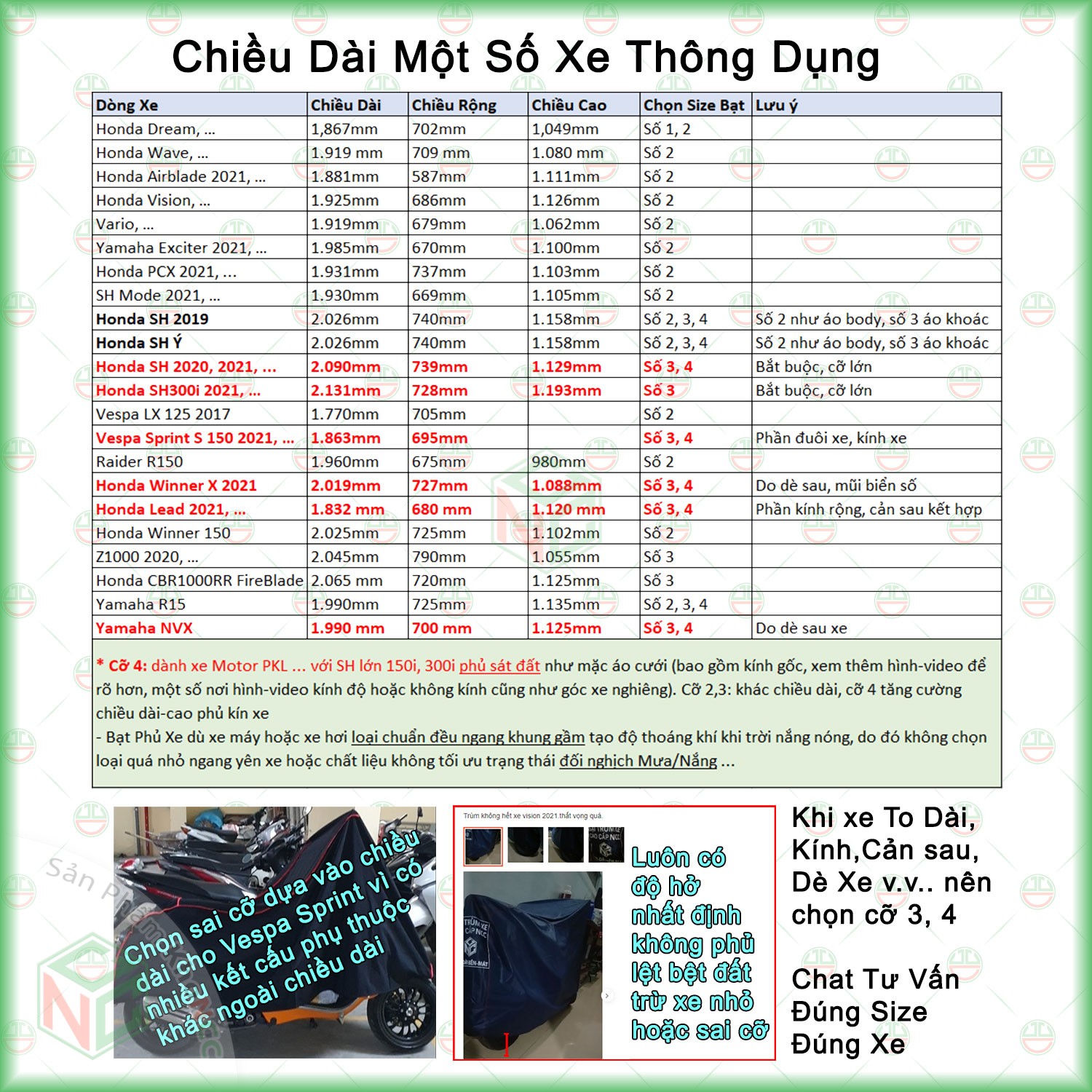 • Cỡ Số 2 - Dành cho xe kích tay ga thông dụng <2.05m như : SH Mode, Vespa, SH125i, SH150i đời cũ trước 2019 (bản mới từ 2020 trở đi phải chọn cỡ 3, tốt nhất chọn cỡ 3), Vario, AirBale đối với dòng SH lớn như SH125i, Sh150i, bạt sẽ hơi kích vì được thiết kế sát theo khung sườn SH lớn (kiểu mặc áo body) , các xe nhỏ hơn sẽ rộng rãi thoải mái (như mặc áo khoác)