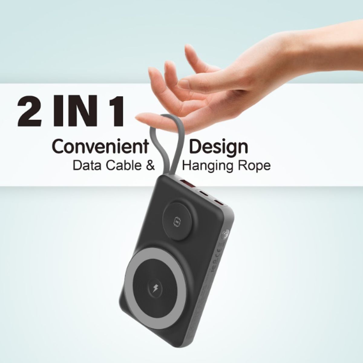 • Được tích hợp thêm quai cầm, có thể móc balo hoặc treo vào bất cứ đâu để mang đi mọi nơi rất tiện lợi. Đồng thời cũng là 2 cáp sạc Type-C và Light.ning độc lập dễ dàng tháo và sạc bất cứ đâu.