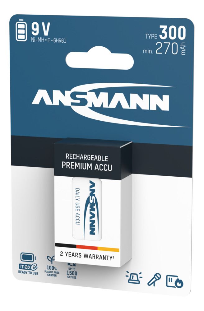 Nhằm tiết kiệm chi phí và thay thế cho những loại pin 9V (E-block) chỉ sử dụng một lần, ANSMANN AG (GERMANY) đã cho ra đời loại pin sạc Ansmann E-block 300mAh dung lượng lên đến 300mAh cho thời gian sử dụng lâu hơn. Pin có tuổi thọ cao, thời gian chờ kéo dài và bạn có thể nạp năng lượng cho pin bằng sạc của Ansmann hoặc các bộ sạc tương thích khác. Pin sử dụng được cho micro, đồ chơi trẻ em và các đồ điện tử dùng pin 9V. Pin sạc Ansmann E-block 300mAh chính là lựa chọn phù hợp dành cho bạn