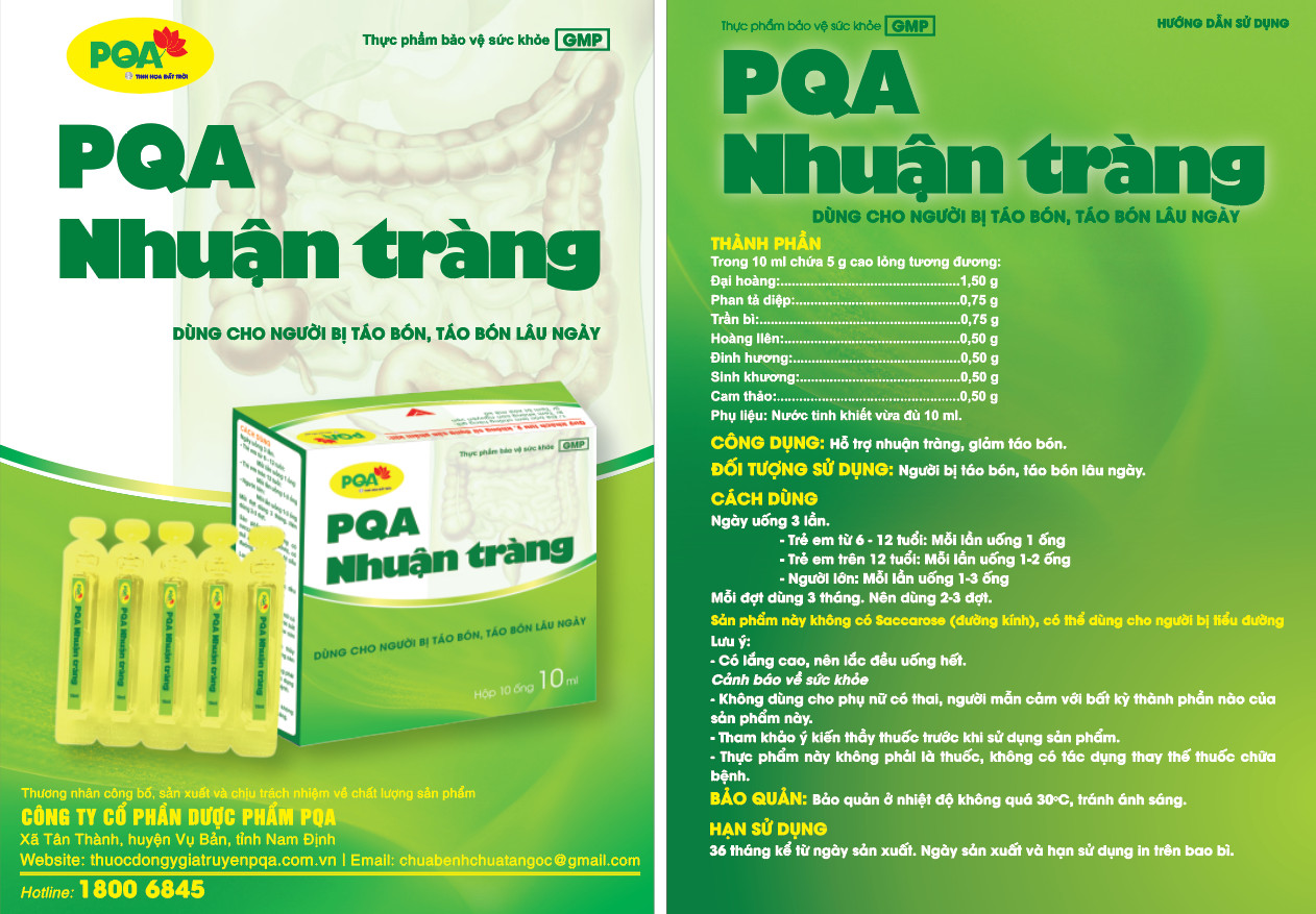 THÔNG TIN PQA NHUẬN TRÀNG DẠNG ỐNG PQA Nhuận Tràng dạng ống là dược phẩm thảo dược có tác dụng nhuận tràng dùng cho người lớn và trẻ em trên 6 tuổi bị táo bón, táo bón lâu ngày. Thành phần PQA Nhuận Tràng dạng ống Trong 10ml chứa 5g cao lỏng tương đương: Đại hoàng: 1,50g Phan tả diệp: 0,75g Trần bì: 0,75g Hoàng liên: 0,50g Đinh hương: 0,50g Sinh khương: 0,50g Cam thảo: 0,50g Phụ liệu vừa đủ 10ml. Công dụng: Hỗ trợ nhuận tràng, giảm táo bón. Đối tượng sử dụng: Người bị táo bón, táo bón lâu ngày. Cách dùng Nhuận Tràng dạng ống PQA Ngày uống 3 lần. – Trẻ em từ 6 – 12 tuổi: Mỗi lần uống 1 ống. – Trẻ em trên 12 tuổi: Mỗi lần uống 1 – 2 ống. – Người lớn: Mỗi lần uống 1 – 3 ống. Mỗi đợt dùng 3 tháng. Nên dùng 2 – 3 đợt. Sản phẩm này không có Saccarose (đường kính), có thể dùng cho người bị tiểu đường. Lưu ý: Có lắng cao, nên lắc đều uống hết. Cảnh báo về sức khỏe – Không dùng cho phụ nữ có thai, người mẫn cảm với bất kỳ thành phần nào của sản phẩm này. – Tham khảo ý kiến thầy thuốc trước khi sử dụng sản phẩm. – Thực phẩm này không phải là thuốc, không có tác dụng thay thế thuốc chữa bệnh. Bảo quản Bảo quản ở nhiệt độ không quá 30 độ C, tránh ánh sáng. Hạn sử dụng: 36 tháng kể từ ngày sản xuất. Ngày sản xuất và hạn sử dụng in trên bao bì. Số đăng ký: 11078/2019/ĐKSP Số XNQC: 02345/2019/ATTP-XNQC