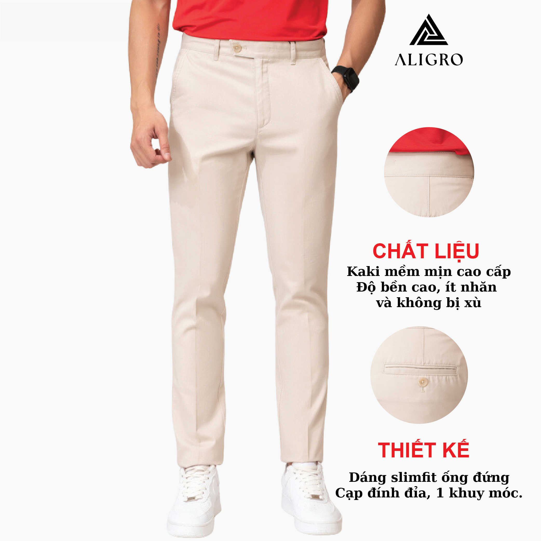 Quần kaki nam Aligro ALGK034 được may từ chất liệu vải kaki bền đẹp, thiết kế đứng dáng mang đến cho phái mạnh phong cách khỏe khoắn, nam tính. Chất liệu vải kaki cao cấp Thiết kế cạp đính đỉa, 1 khuy Dáng Slim-fit, ống đứng HƯỚNG DẪN BẢO QUẢN ÁO – Không giặt bằng xà phòng có độ tẩy cao – Nên lộn trái sản phẩm khi phơi – Không phơi trực tiếp dưới nắng gắt