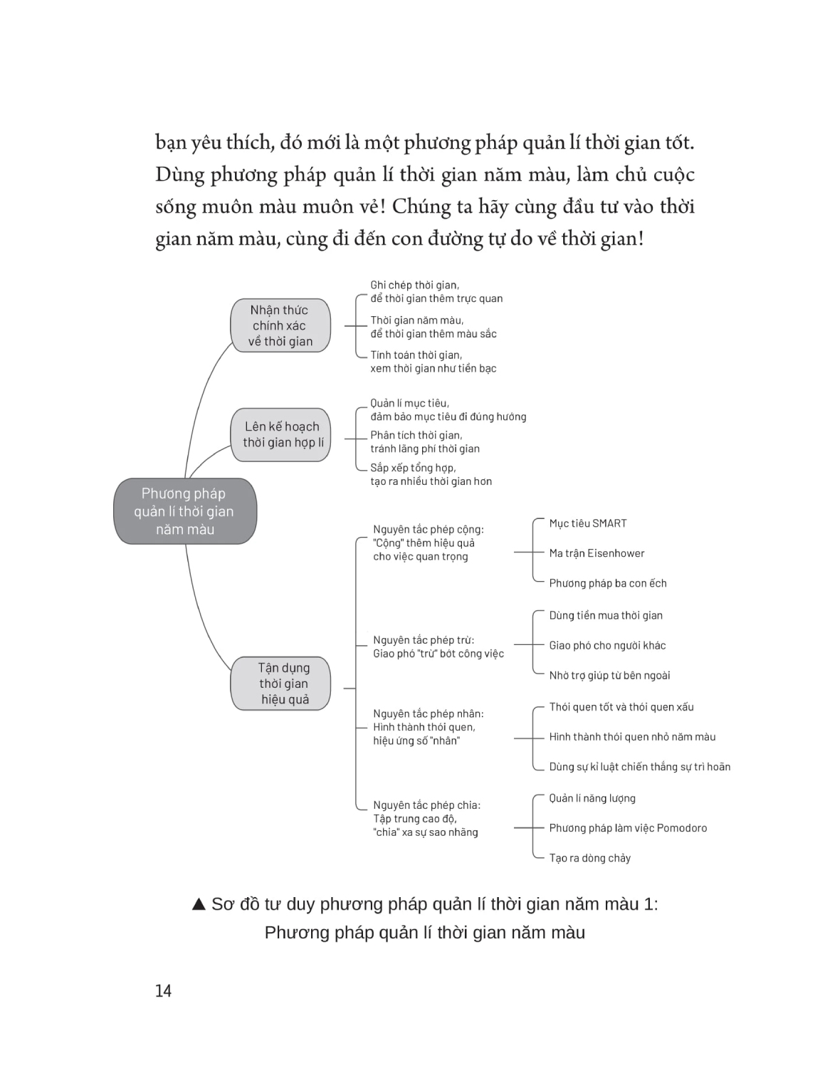 - Cấp độ thứ năm: Hình thành những thói quen nhỏ, khiến việc duy trì trở nên dễ dàng hơn. Cuốn sách này đưa ra 3 mẩu chuyện ngắn về phương pháp quản lí thời gian năm màu, 13 thực chiến quản lí thời gian năm màu, 14 cẩm nang phương pháp quản lí thời gian năm màu và 26 sơ đồ tư duy phương pháp quản lí thời gian năm màu. Trong phần Phụ lục có 11 lý thuyết quản lí thời gian thường thấy, 5 ứng dụng thường dùng để quản lí thời gian, danh mục sách tham khảo về quản lí thời gian và năm màu trong cuộc sống. Áp dụng phương pháp này vào thực tế, bạn sẽ sống một cuộc đời đầy màu sắc, cân bằng và tự do hơn!