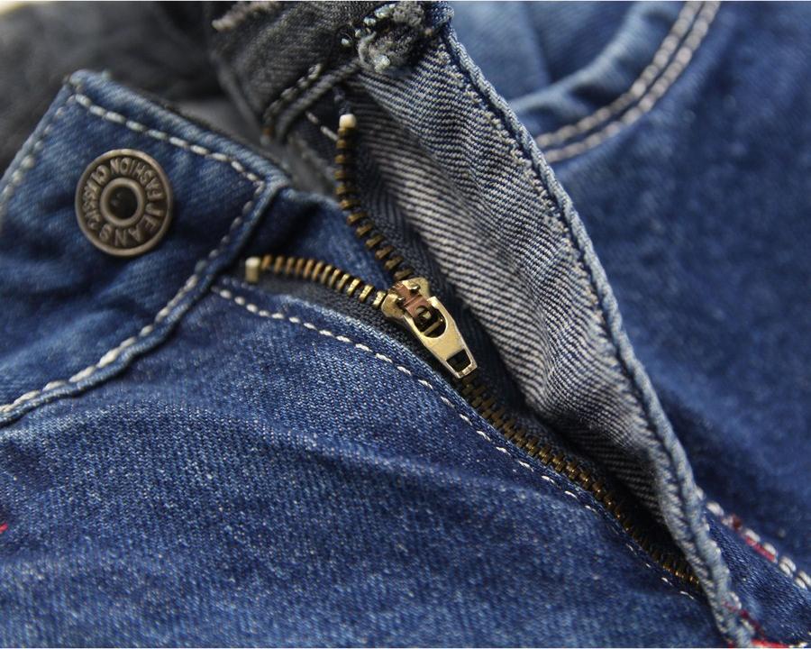 Quần được may với chất liệu jean dày loại tốt, đảm bảo độ bền trong hai năm sử dụng.