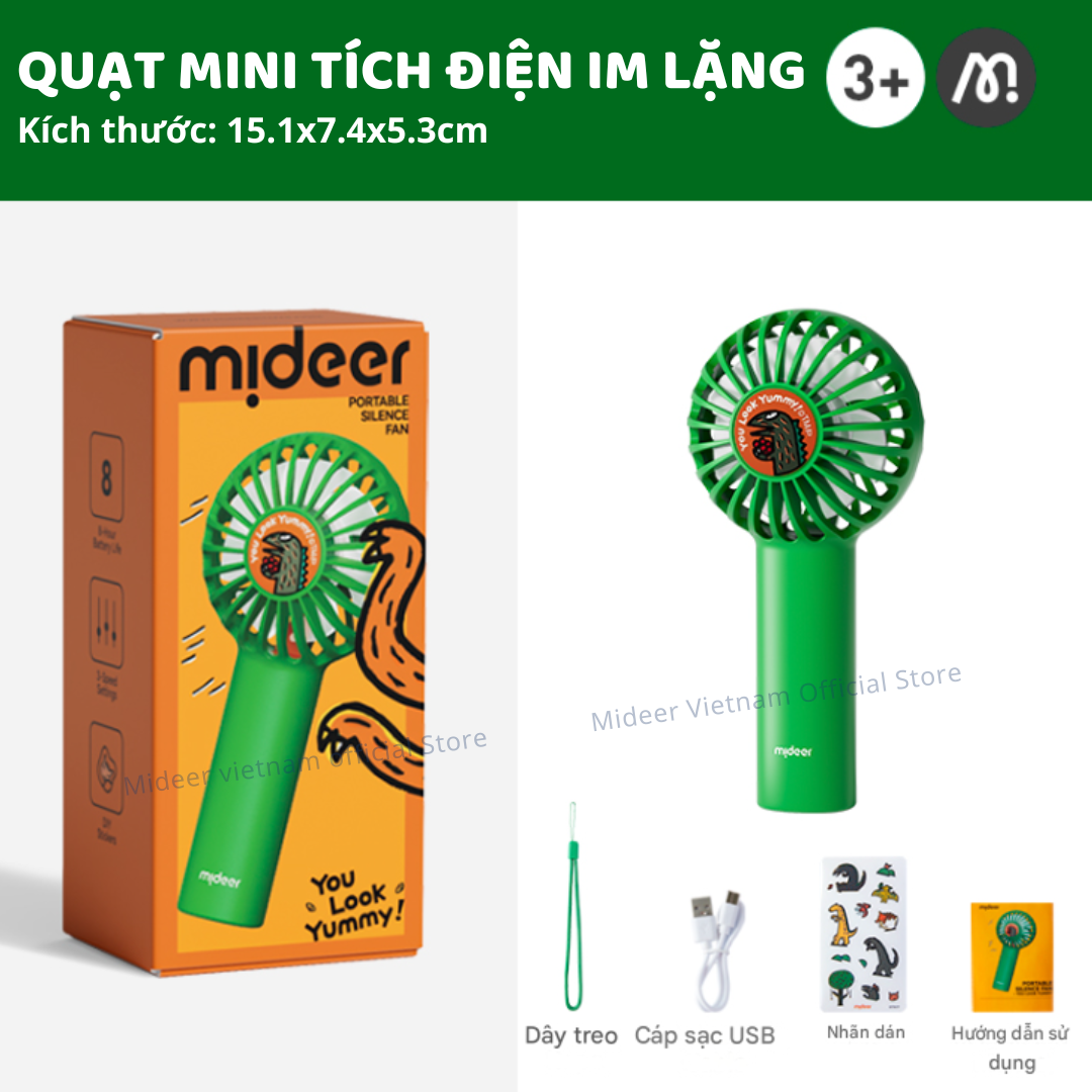- KÈM NHÃN DÁN ĐÁNG YÊU- Khuyến khích trẻ phát huy trí tưởng tượng với nhãn dán hình khủng long vui nhộn, giúp bé trang trí quạt mini của mình theo phong cách riêng, tạo thêm phần thú vị cho sản phẩm. Quạt cầm tay mini tích điện cho bé Mideer Portable Silence Fan